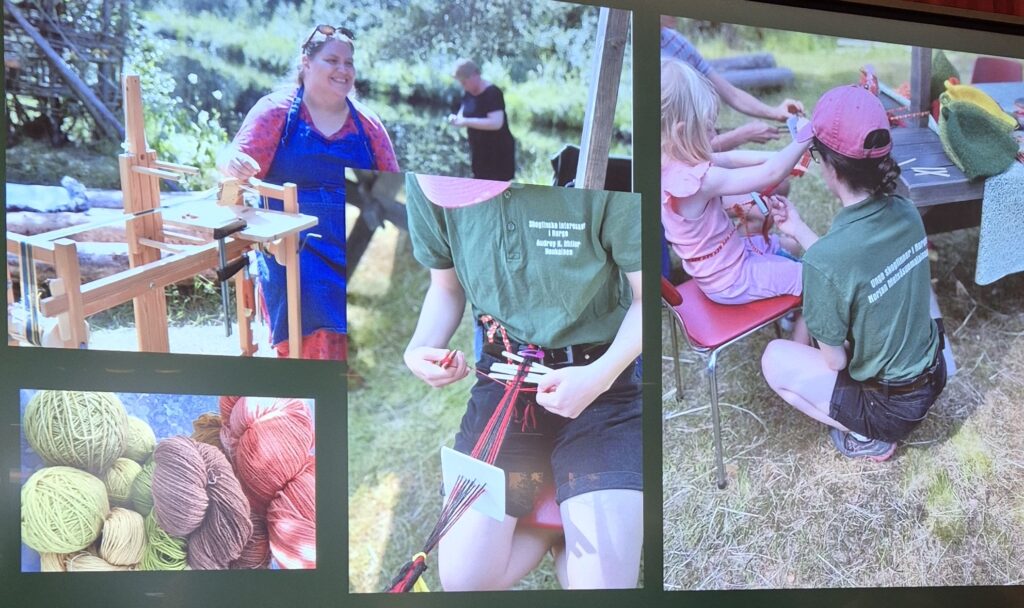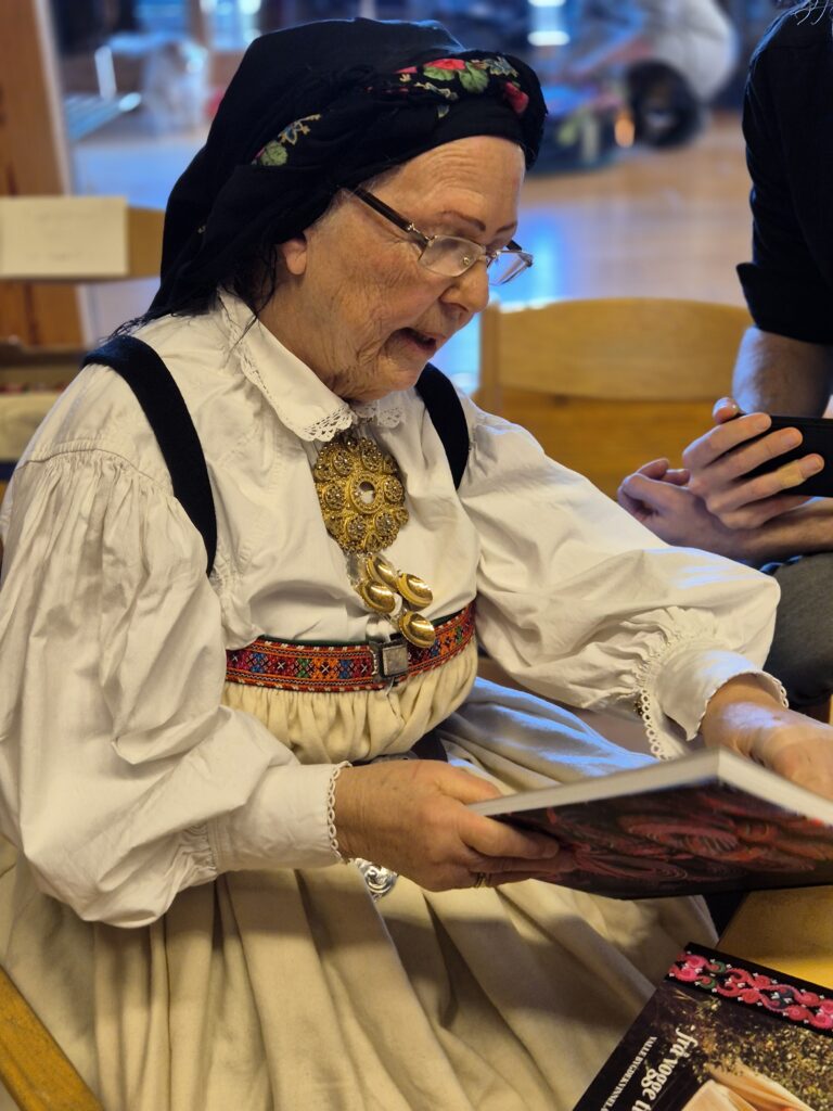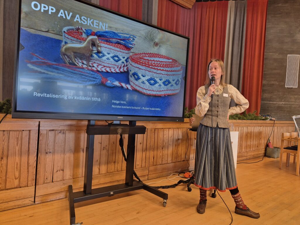 Neste post på programmet var Helga Vara sitt foredrag: Opp av asken- revitaliseringsarbeid fra et minoritetsperspektiv. Helga er vever og håndverker og hun sitter i styret av Norske kveners forbund – Ruijan kvääniliitto, der hun har ansvar for kvensk draktutvalg. Det var både rørende og inspirerende å høre om utfordringene med revitaliserings arbeidet for kvener. For hvordan går man frem når man har tapt så mye materiell kultur, klær, redskaper, kunnskap- både gjennom fysisk ild og brent jord og gjennom tiltak på samfunnsnivå spesifikt utformet for å viske ut identitet. Det var en glede å høre om hvordan man kan samle trådene, løfte blikket, rette opp ryggen og starte fra en kant – med sterkt pågangsmot og entusiasme for å skape nye tradisjoner i kvensk håndverk, käsityö samtidig som man bygger på det som er igjen av de gamle. Helga har skrevet litt om helgen her: https://www.ruijan-kaiku.no/kasityo-er-kulturarv/