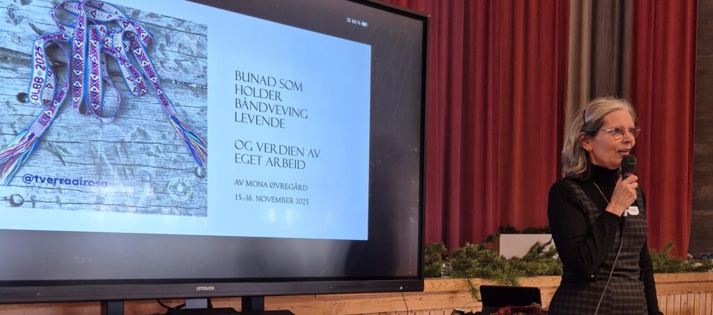 Et kjent fjes for mange som vever bånd litt lengre sør er Mona Øvregård. Mona holdt et viktig foredrag om hvordan vi må huske verdien av eget arbeid og hvordan bunadbruk kan bidra til å holde båndvev levende. Mona, som har en bakgrunn fra markedsføringsbransjen tok oss gjennom en strukturert og tydelig markedssanalyse. Blant annet utforsket hun temaet hvem er «konkurrenten» for oss som vever bånd for hånd. I all hovedsak er konkurrenten maskinproduksjon og at håndveving blir sendt utenlandsk. Hva er konsekvensene hvis vi sitter igjen med kun utenlandsproduksjon? Hun snakket også om hvordan det er viktig at vi prissetter det vi lager på en fornuftig måte som gjenspeiler hvor mye tid, krefter, kunnskap og kulturarv som ligger bak hvert enkelt bånd. Tør vi ikke ta oss betalt, vil ikke heller kunden skjønne verdien av gjenstanden. Har man ikke mulighet til å kjøpe håndverk, kan må få gleden av å lære å veve selv. Som mange av oss samlet denne helgen holder Mona også (veldig gode!) kurs.