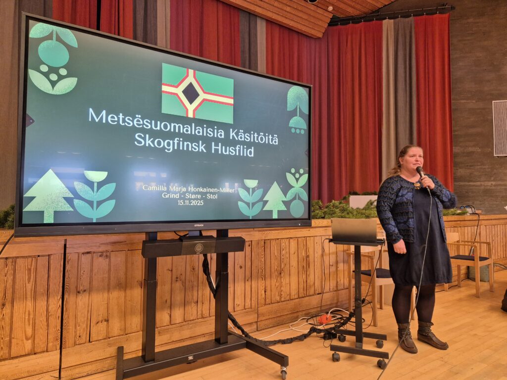 Camilla Honkainen-Miller holdt et innholdsrikt foredrag om Skogfinske tradisjoner. Hun innledede med å henvise til en undersøkelse gjort av Norges institusjon for menneskerettigheter (NIM) som viser at 38% av befolkningen aldri har hørt om skogfinner, 90% av befolkningen lærte lite eller ingenting om skogfinner på skolen og 84% har lite eller ingen kunnskap om skogfinner i dag. Heldigvis fikk Camilla hjulpet alle i salen ett godt stykke på vei til å lære litt mer om skogfinner, skogfinsk håndverk og båndvev. Camilla holder kurs og brenner for å videreformidle kunnskap- og jeg tror ikke jeg var alene i salen om ha lyst til å besøke henne og lære mer om skogfinsk håndverk.