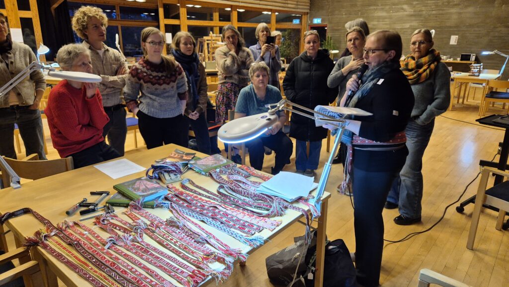Neste foredrag holdt jeg selv; Bandvev for alle! Jeg fortale litt om registeringsarbeidet vi har gjort i Åmli og om bokprosjektet Vovne Skattar, som ble til ut av et ønske om å tilgjengeliggjøre informasjon om vevde bånd fra Åmli slik at alle kan ha glede av det og veve nye bånd selv. Jeg håper også jeg greide å formidle hvor mye jeg brenner for å løfte frem veving av bånd på vegne av alle oss som driver med dette. Jeg vil bidra til å sikre at vi holder på og videreformidler kunnskapen om hvordan vi vever og hvordan båndene passer inn i hverdag og høytid.
