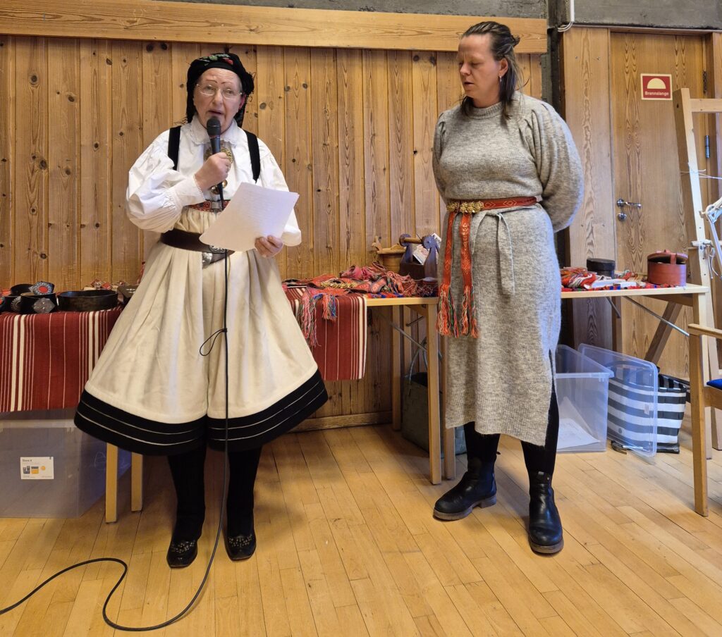 Det siste foredraget denne helgen var kanskje ekstra spesielt for mange. Vi fikk æren av å ha May-Lis Flateland og hennes barnebarn Petra Marie på besøk. De hadde også rigget til en fantastisk og rikholdig utstilling av gjenstander fra Setesdal, ikke bare plukkebånd men også broderte jurer, brikkevevde stakkelister og mye mer. May-Lis fortale om tradisjoner og om arbeidet med boka Gjøymde og gløymde skattar av Grete Fossen, May Lis Flateland og Eli Straume Føreland, utgitt av Valle Bygdekvinnelag.