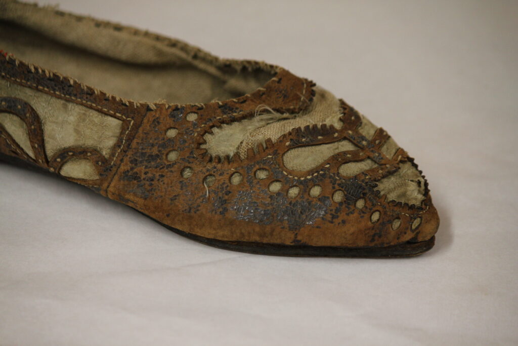 To sko som ble registrert hver for seg er nå blitt til et par igjen, de slapp med skrekken!Sjekk den stikningen! (pyntesøm) det er ikke tunnelsøm, men en tråd lagt inn i sømmens overside. Overlæret er enten semsket eller kjøttsiden ut.Disse er nå på tegnebrettet, jeg måler og styrer, ser etter størrelses forhold, og skjulte meninger. Men mest av alt gleder jeg meg til å gå med dem!Ja dette er uten tvil til en folkedrakt. Jeg fikk også sett nøyere inni. Enkel i utseende, med flere bånd støttefòr på innsiden som hjelper et mykt overlær. En kuriosa. Den er jo ikke typisk vendsøm, men en sko fra Empire tiden. Men kan det være en litt mer allmue sko, altså ikke de rikeste, men allike vel en sko som ble sydd for hånd av hun som skulle ha dem og skomakeren satte dem sammen? Den fikk jeg altså sett inni, fòret i skaftet med samme skinn som hæltrekket, hvit lam eller kje. Brun rand altså ikke vendsydd i teknikk, men i utseende. Blå ullsateng (?)Hvitt bendelbånd (fiskeben) forsterker alle sømmer og sårkanter et hvitt pyntebånd fra skotuppen til under spennen.Restefest i overlæret, mange sko ble laget av rester, biter av tøy til klær, som kan brukes til sko. Men ble dette brukt til sko i folkedrakten? Prinsippet er forståelig nok, men ble det brukt -ikke ute, men inne blandt folk?