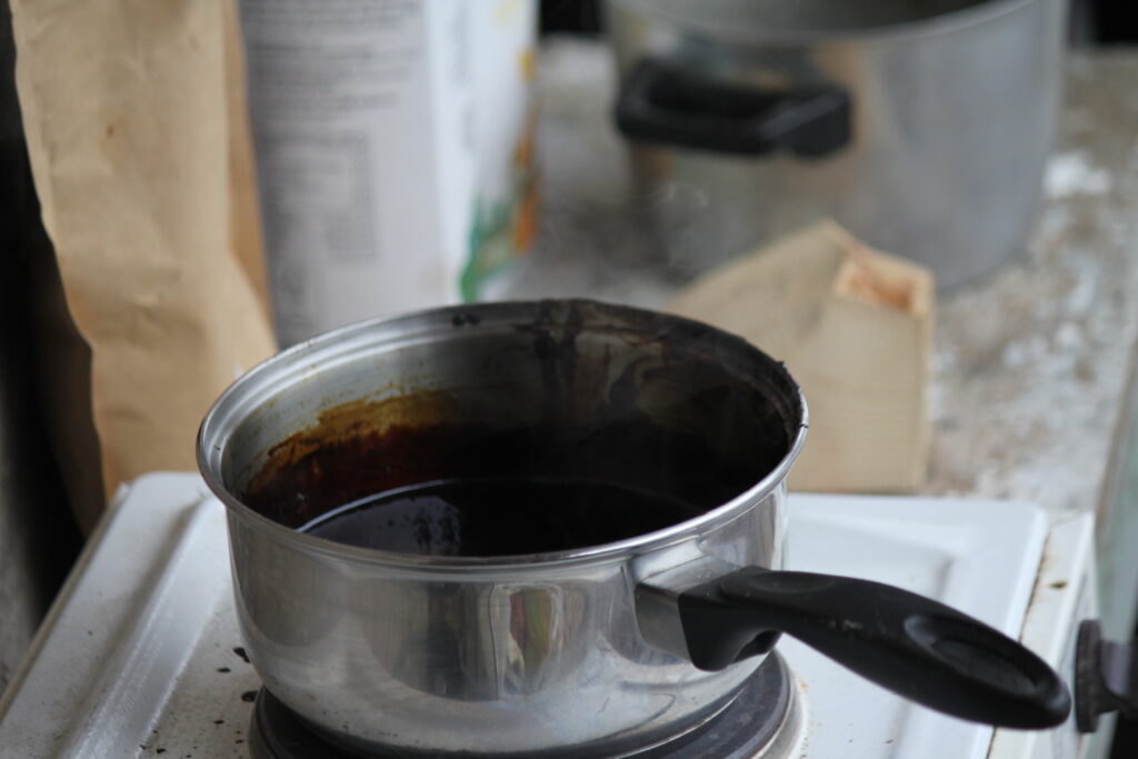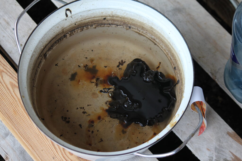 Når den vesle prøven i vann er hard og ikke klisser, heller du av gryten over i en melkekartong.