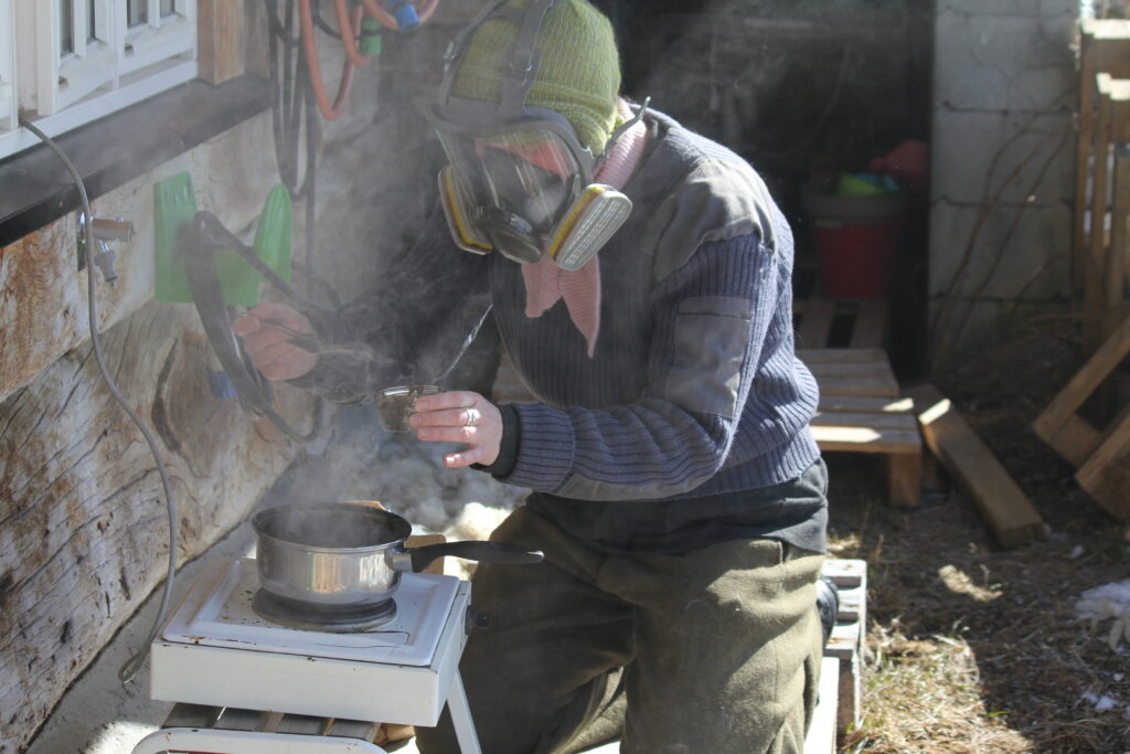 Shoemakers use a blend of tar (from wood, not petrochemical), cholophonium and beeswax. I start off with a 0.3 liter or 1/2 pint of tar. I melt a handfull of cholophonium at at time(I measure the weight of the bag I poured from, before and after finish) Do this outside, or suffer the smell and pain. A gasmask is simply a smart choice.