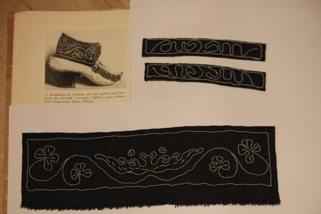 I Jäfvert er det avbildet «A. Kragkänga av rensskinn med röd vadmål och broderier av tinntråd. 1700 -talet. Tillhör (1936) Friherre Cark Gripenstedt, Bysta, Kilsmo». Det slår meg at noe er spesiellt ved denne skoen. Høy hæl som en by-sko, men vadmål med tinnsøm og renslegg. Det må være et folkedrakt produkt! Og som en ungpike greide jeg ikke glemme den skoen. Svart/hvitt, bildet er tatt litt på skrå bakfra. I en teknikk og i et fag jeg ikke kan.