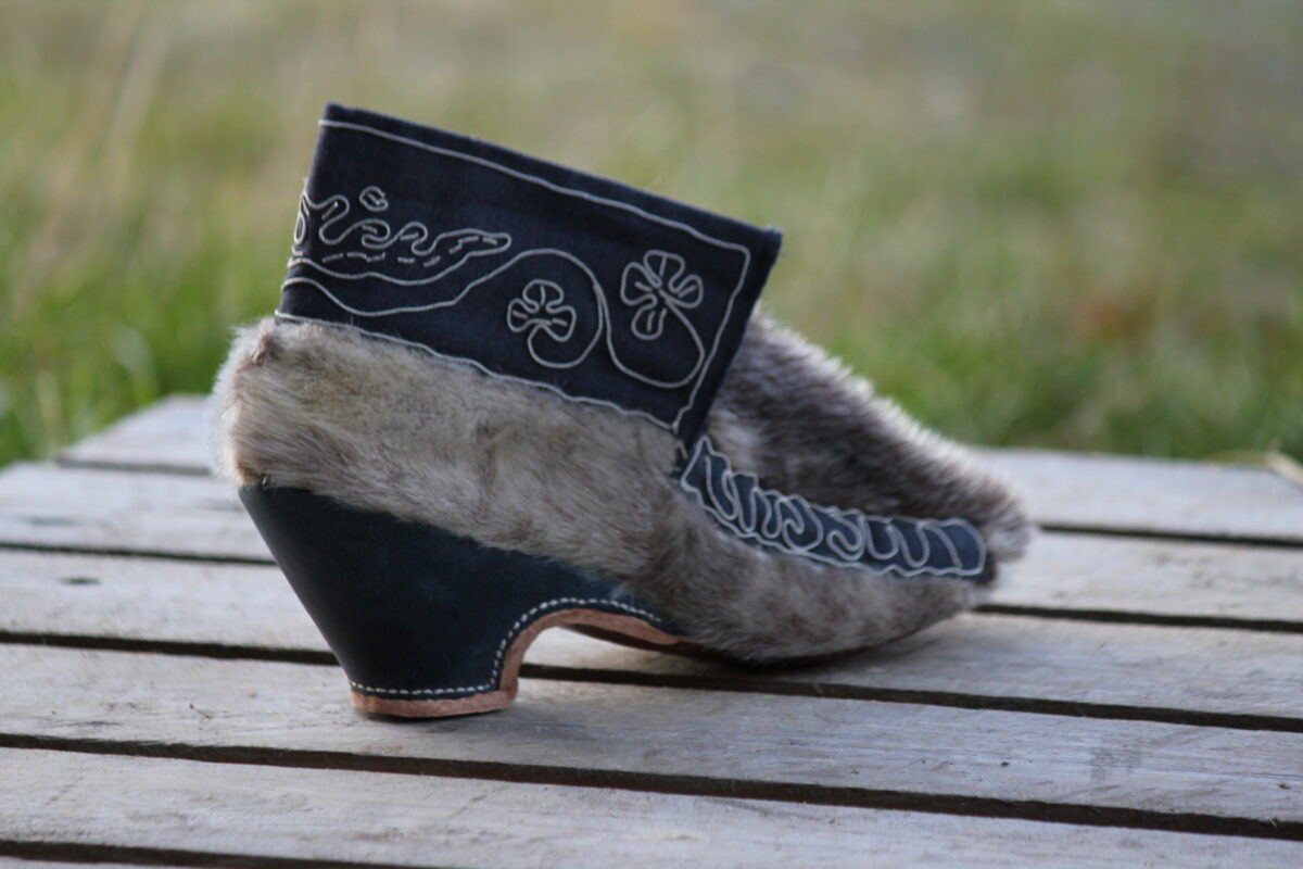I Jäfvert er det avbildet «A. Kragkänga av rensskinn med röd vadmål och broderier av tinntråd. 1700 -talet. Tillhör (1936) Friherre Cark Gripenstedt, Bysta, Kilsmo». Det slår meg at noe er spesiellt ved denne skoen. Høy hæl som en by-sko, men vadmål med tinnsøm og renslegg. Det må være et folkedrakt produkt! Og som en ungpike greide jeg ikke glemme den skoen. Svart/hvitt, bildet er tatt litt på skrå bakfra. I en teknikk og i et fag jeg ikke kan.