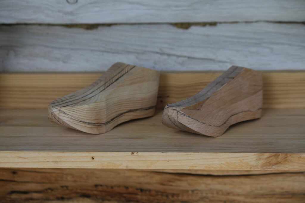 English: I draw a line 1 cm from the sole and the midlines on top and the heel. The wood is sanded down.