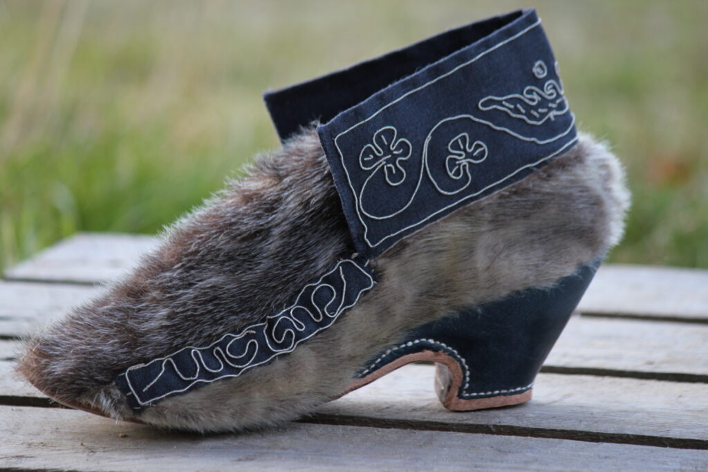 Denne skoen så jeg på et foto i Ernfrid Jäfverts «Skomod och skotillverkning» fra 1937. Skoen er fra 1700, hvit rensskinnlegg og tinnsøm på rød vadmål.