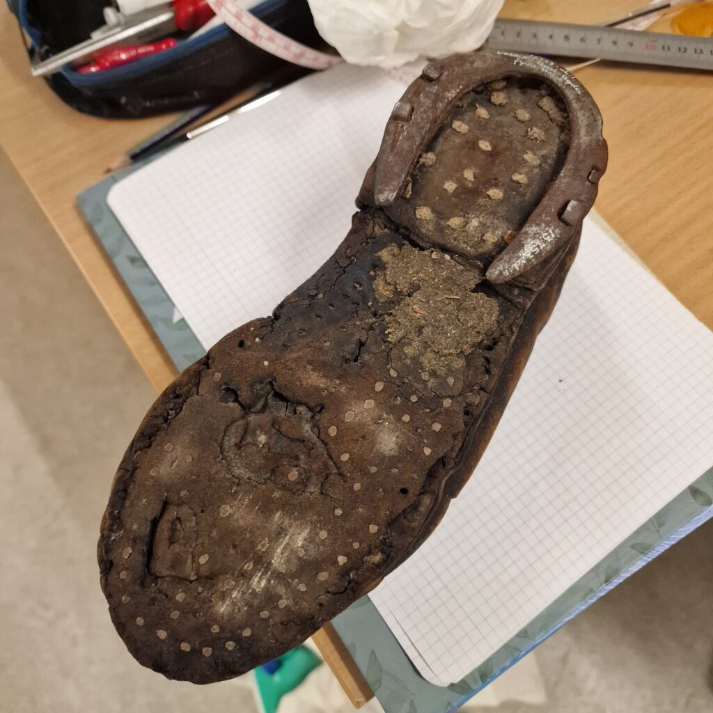 Om arbeidssko fra Valle i Setesdal. Heidi viste meg senere ivrig noe som var laget så ille at det nesten var bedre på den måten. Jeg ville påstå at at vi kanskje kan anta at noen var full på jobb, eller ikke hadde tid, virkelig ikke. Som heljern har vedkommende brukt en tilnærmet lik hestesko, som var litt for stor, men det er jo ingen som legger merke til…