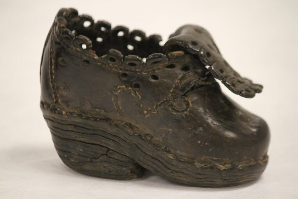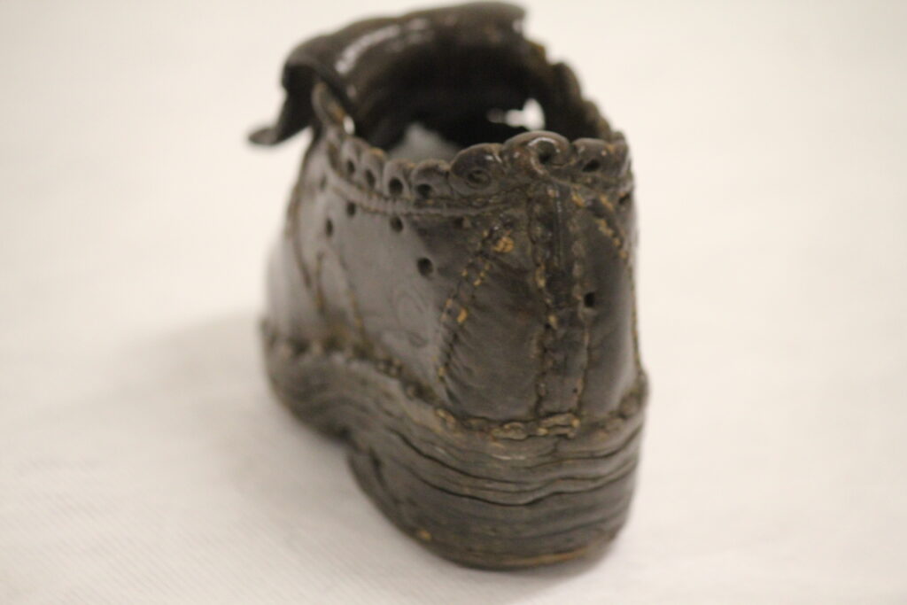 Heidi viser ivrig frem et par barnesko, som er skåret i et stykke, der det er en tynn bit av læret midt bak som blir den blonden vi ser uten å legge merke til det.