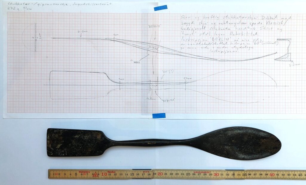 Stor gipsmakerspatel/ -skje, 41cm. Fra Jugendstilsenteret og KUBE/ VITI- Musea sin samling. Foto: Peder Alme v/ Norsk Håndverksinstitutt 2026