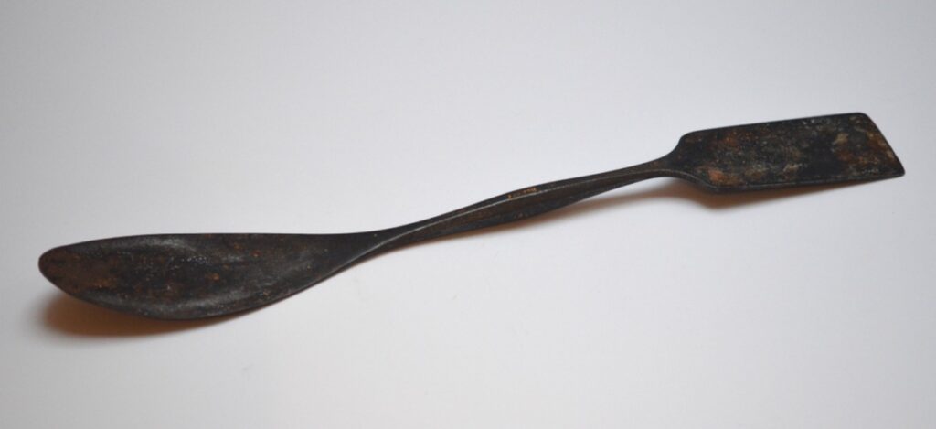 Nest er det den store gipsmakerskjeen (spatel) som fanger mitt øye. Denne er mye større enn de gipsmakerspatlene som er i handelen i dag, og godset er tyngre og tykkere. Den er tydeligvis tysk da det er gravert inn «BERLIN» på skaftet, sammen med det som ser ut som tallet «60». Det andre gipsmakerverktøyet (skrapeverktøyet/ rissenålen) har samme kvalitet, og er også merket «BERLIN», og tallet «128».