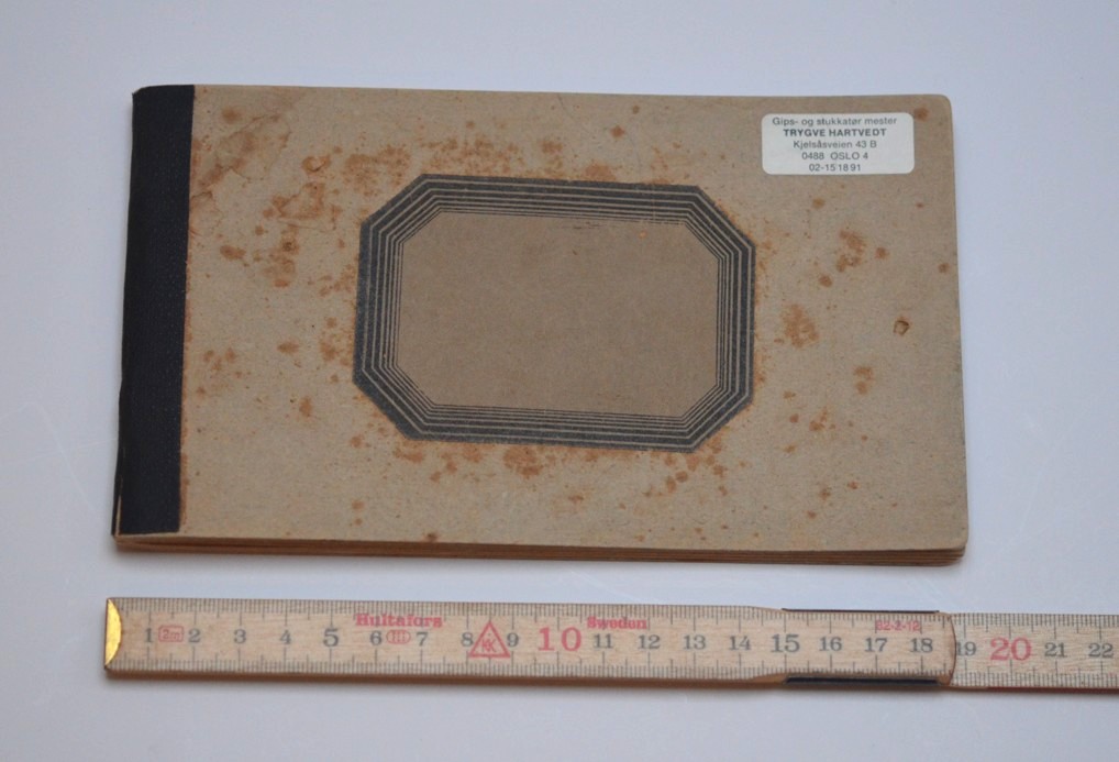 Stukkatøren Mons Hartvedt sin tegnebok. Gitt av gipsmaker Trygve Hartvedt. Fra Jugendstilsenteret og KUBE/ VITI- Musea sin samling. Foto: Peder Alme v/ Norsk Håndverksinstitutt 2026
