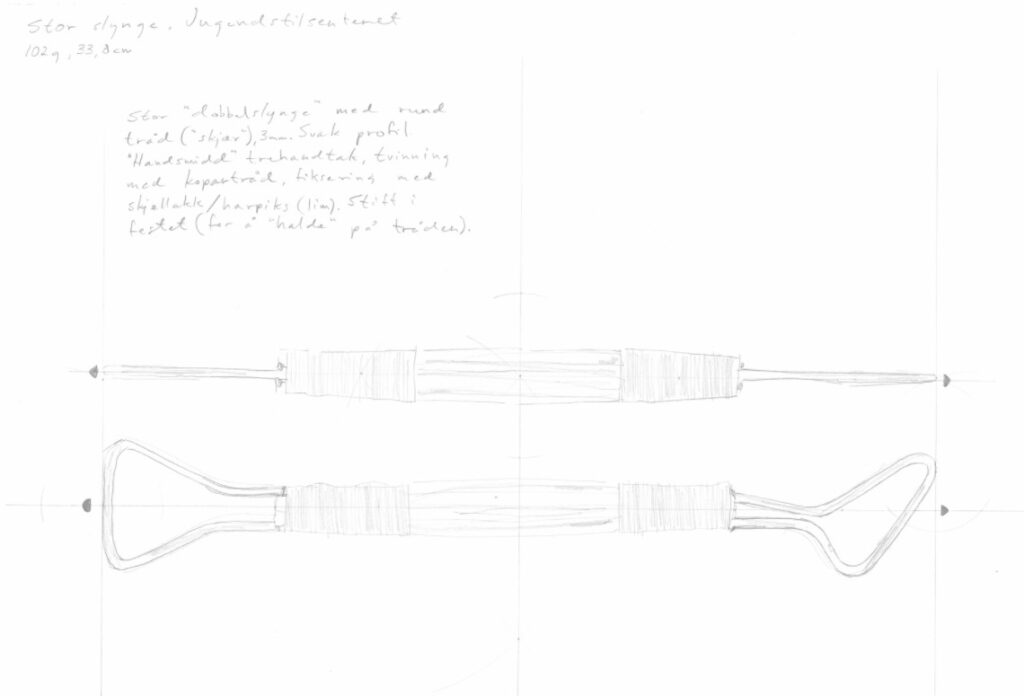 Tegning av stor dobbel slynge, 33,8cm. Foto/ tegning: Peder Alme v/ Norsk Håndverksinstitutt 2026