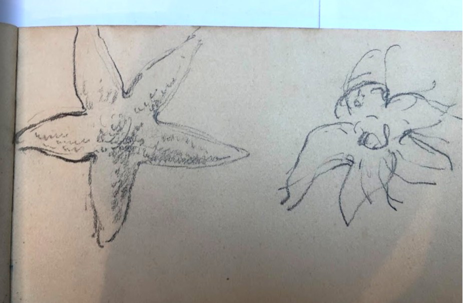 Tegneblokken er ikke fullt ut tegnet i, og mange av sidene er blanke. På de siste sidene- etter flere blanke sider- er det som ser ut som observasjonstegninger av en sjøstjerne; en rask skisse (bevegelsestegning5) og en mere presis avbildning. Kanskje var dette ide- tegninger til en ornamentikk med sjøstjerner?