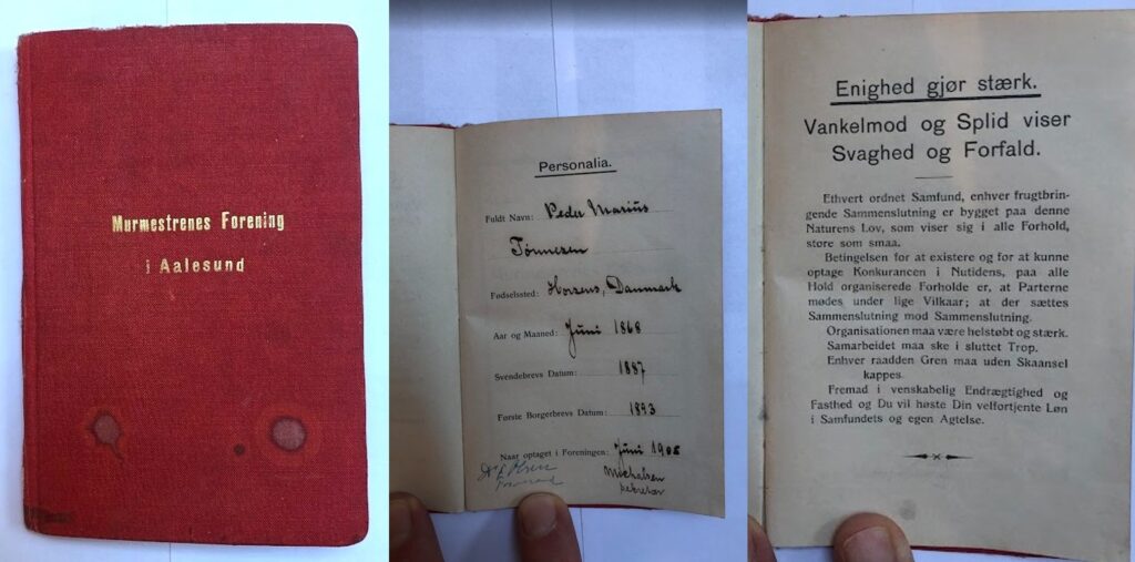 En annen morsom liten «skatt» i Jugendstilsenteret sin samling er en medlemsbok i Murmestrenes Forening i Aalesund fra 1906, for den danske mureren Peder Marius Tønnesen.