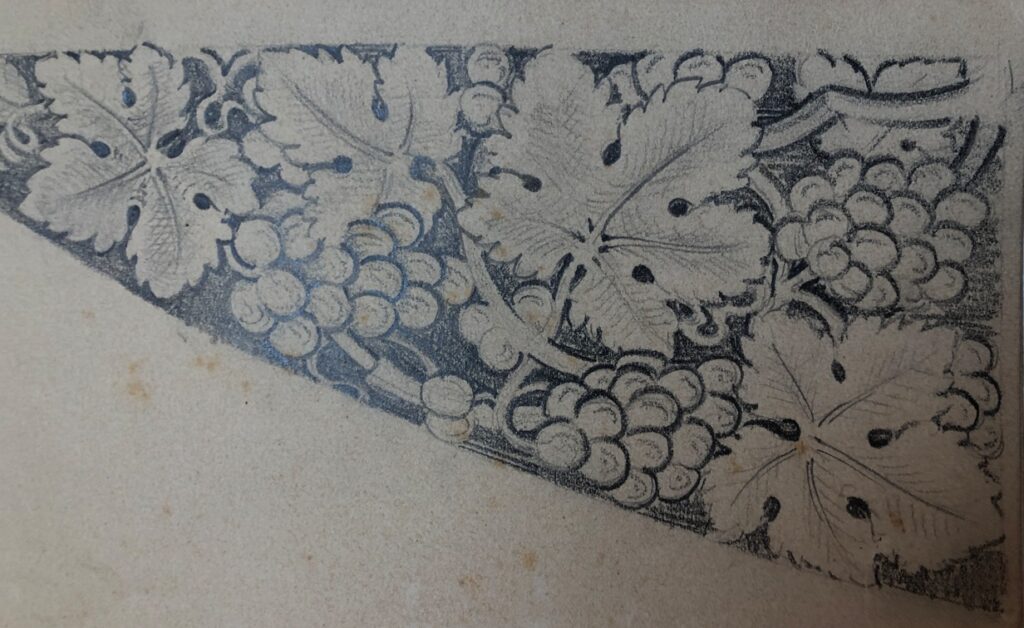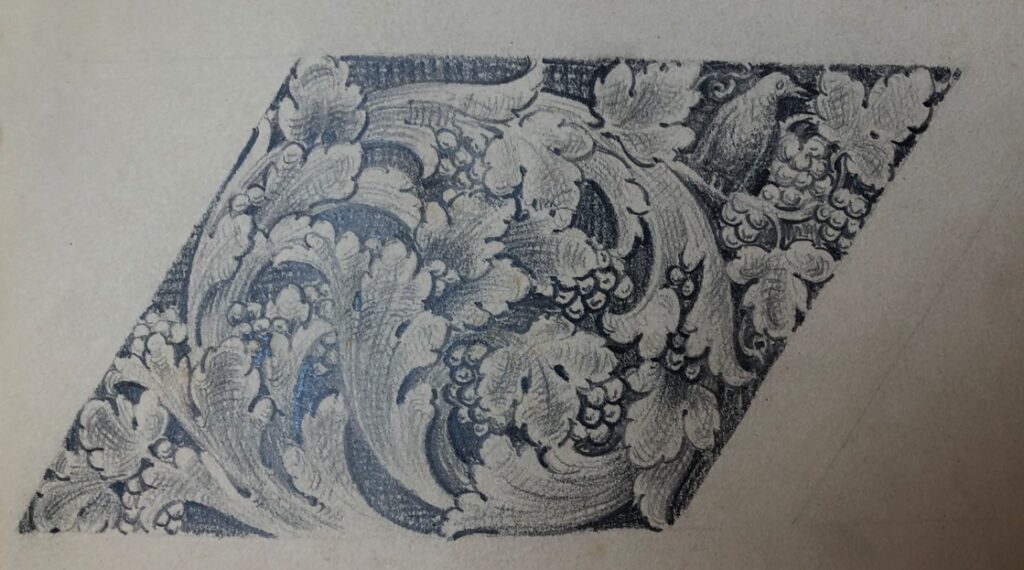 Vinbladdekor fra stukkatøren Mons Hartvedt sin tegnebok. Fra Jugendstilsenteret og KUBE/ VITI- Musea sin samling. Foto: Peder Alme v/ Norsk Håndverksinstitutt 2026