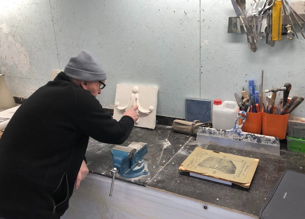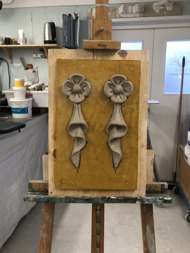 Jeg viste bl.a. et blomster-/ bladornament8 som jeg hadde jobbet med. Leon snudde med det samme gipsmodellen på hodet, og viste til at noen detaljer «falt i skygge» når han gjorde dette!
