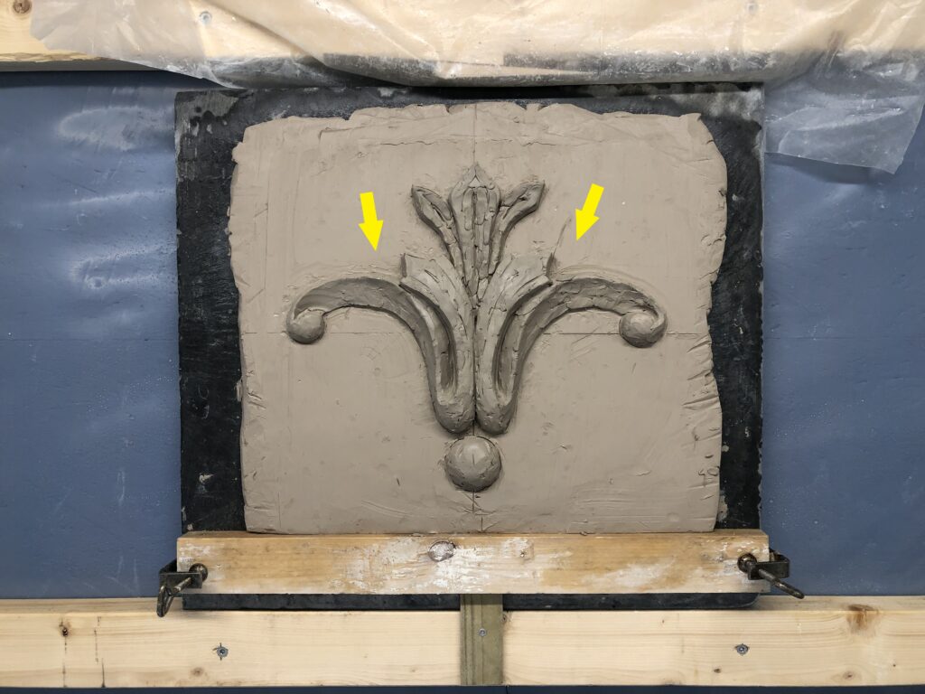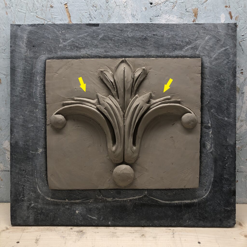 På blomster-/ bladornamentet som jeg har modellert flere ganger nå, har jeg i den siste versjonen fjernet disse små «vingene» som «havnet i skyggen», som vist på bildene under (gule piler): motivet er forenklet, og jeg synes med det at lesningen er bedre.