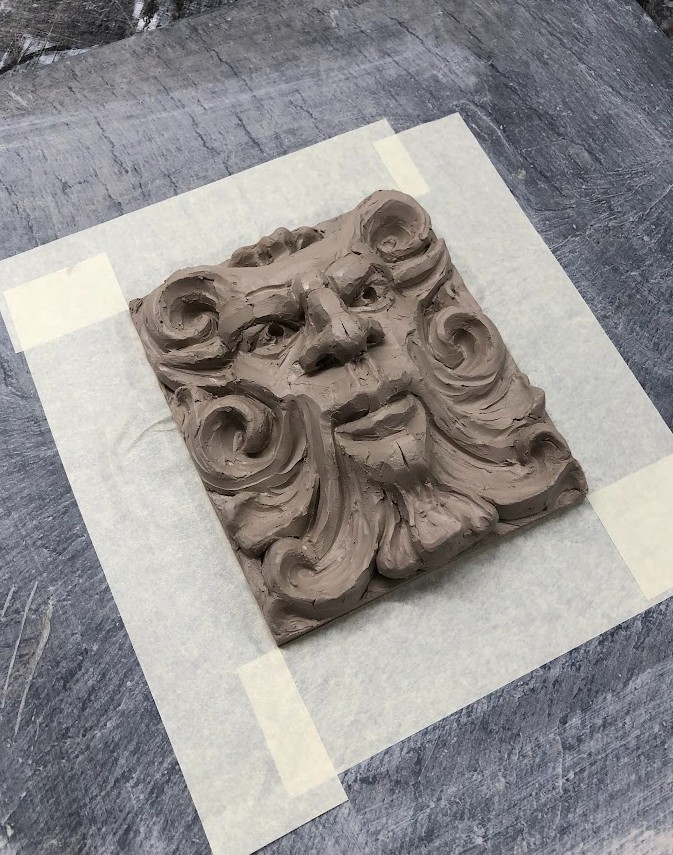 Jeg har også modellert et lite maskeornament (ca. 12x15cm) inspirert av Latinskolen (eller Vestre gamle kapell?); en slags «grønn mann»9. Jeg synes den ble litt kul, og av en eller annen grunn er jeg mere komfortabel med å modellere (ut fra) figurer, enn f.eks. plantedekor. Hvorfor det er slik vet jeg ikke. Jeg har nok mer erfaring fra før med figur- modellering, så det kan nok være en del av grunnen …