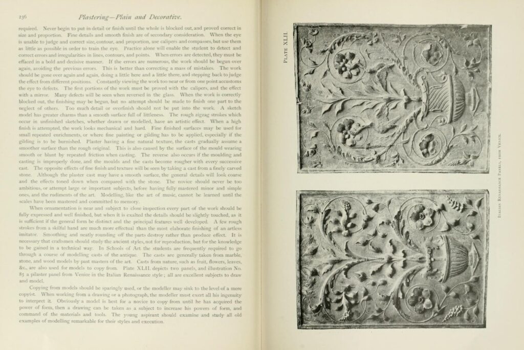 With a little practice with the material, it is just as easy to model in cement or stucco as in clay (…) Hand work is simply modelling direct with stucco, cement, or plaster. The work may be done in situ or on slabs, and then fixed. The art of hand work in the past had a wider range than at present, when all the ornamental work was done by hand, executed in the freest manner in soft plaster, and with excellent effect on the walls and ceilings of which they form the decorations6.