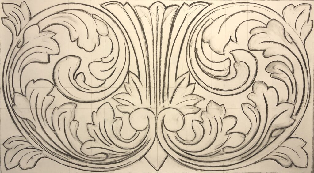 I prosessen med å lage det nye ornamentet lagde jeg også en kulltegning i størrelse 1:1, som er «sporet» etter bitene fra det originale ornamentet. I lag med gipsavstøpningene blir denne en viktig del av det å dokumentere/ bevare det «tapte» ornamentet sitt uttrykk for ettertiden.