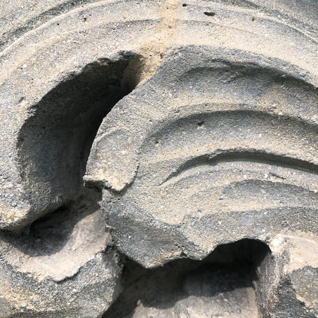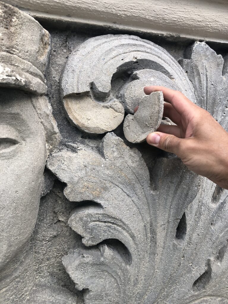 Ornamentene på Latinskolen er bygget opp i flere lag med mørtel. Bitene fra det gamle ornamentet kan splittes/ klyves, og bitene deler seg da mellom de ulike lagene med mørtel som ornamentet er bygget opp av. Slik kan jeg studere oppbygning og verktøyspor- altså for forstå dette håndverket bedre.