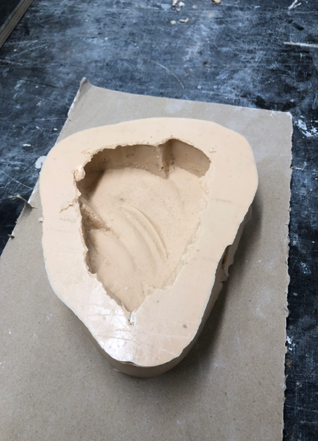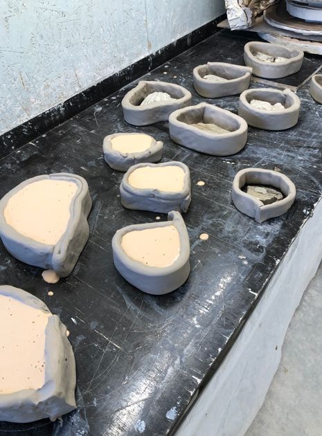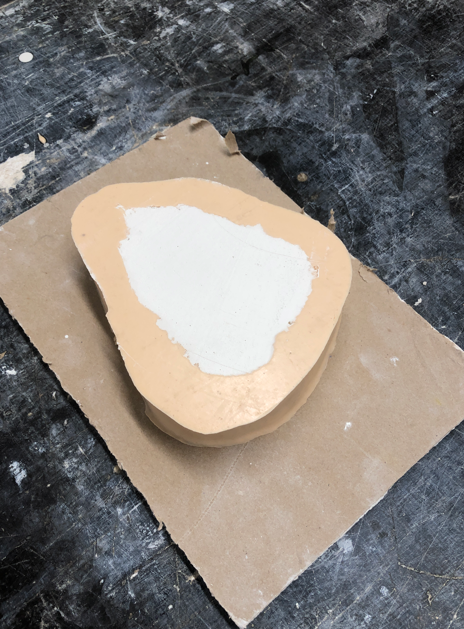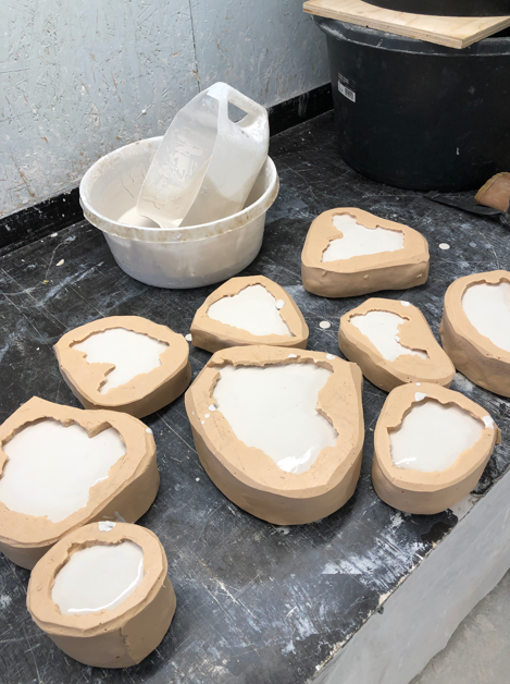 Gipsavstøpningene ble gjort med ringer av leire rundt hver (lille) bit, som en ramme eller forskaling (tenk betongstøp). I hver ring- og over hver bit- ble det tømt alginatmasse. Alginat er et form- stoff der et tørt pulver blandes med vann i ønsket konsistens, og påføres det det skal tas avtrykk av. Alginatmassen er snar med å binde (les: tørke, stivne, sette seg), og danner en geleaktig konsistens (den er fleksibel).