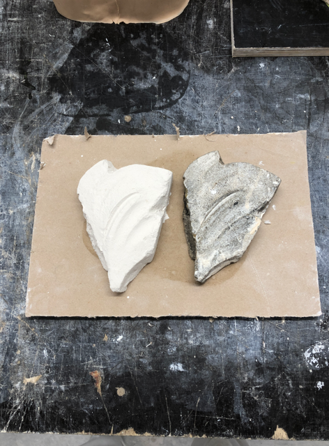 Bitene fra det originale ornamentet har i mellomtiden ligget i bøtter og spann på verkstedet, og nå i stipendiatperioden min har jeg en god anledning til å studere disse bitene for å forstå bedre hvordan håndverkeren har håndtert mørtelen og verktøyene som ble brukt.