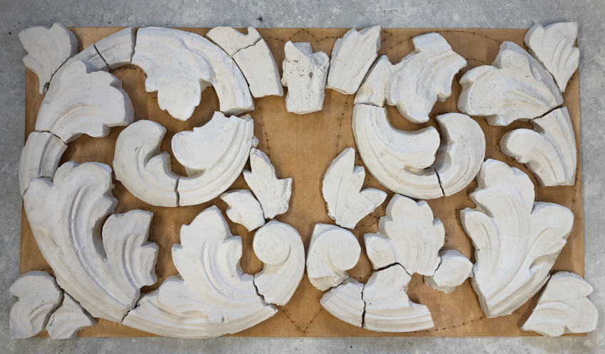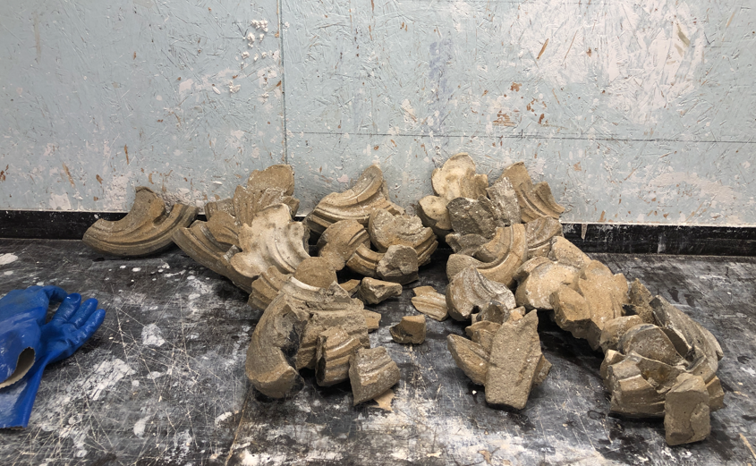 Under: Fra arbeidet med å lage gipsavstøpninger av bitene av det skadete ornamentet.