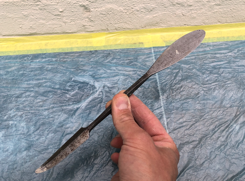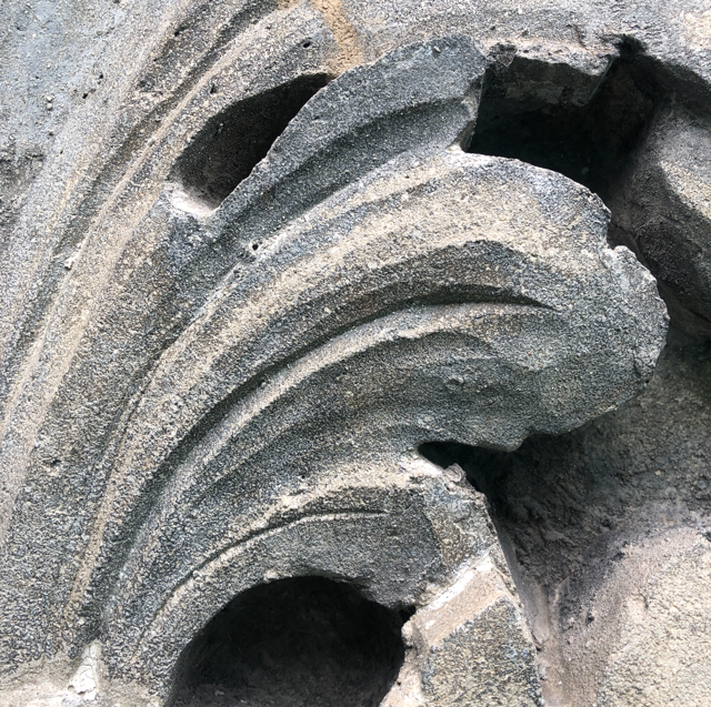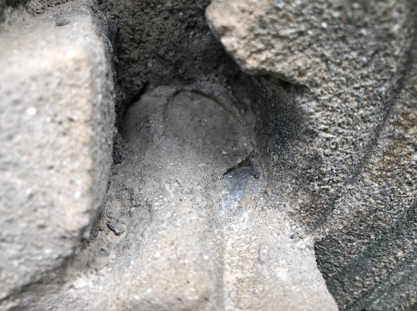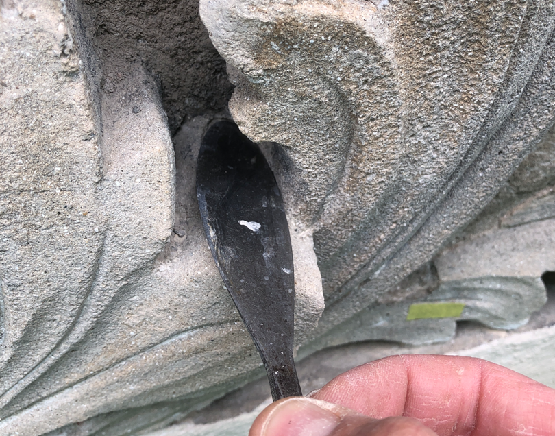 Jeg har også tidligere studert verktøyspor på de andre (og gjenværende) ornamentene på Latinskolen slik som de står på veggen. Det er interessant å se hvordan de ulike mørtellagene ligger over hverandre, og å ane kvaliteter av konsistens og plastisitet i ornamentene sine ulike former og overflater. Ekstra morsomt er det når jeg har observert direkte spor (avtrykk) av håndverktøyene som er brukt. Ett lite avtrykk- et strykejernsformet spor- på ett av ornamentene (motivet er en hanekylling) er helt likt i fasong og størrelse som et av de verktøyene jeg selv har i min egen veske- en såkalt gipsmakerspatel.