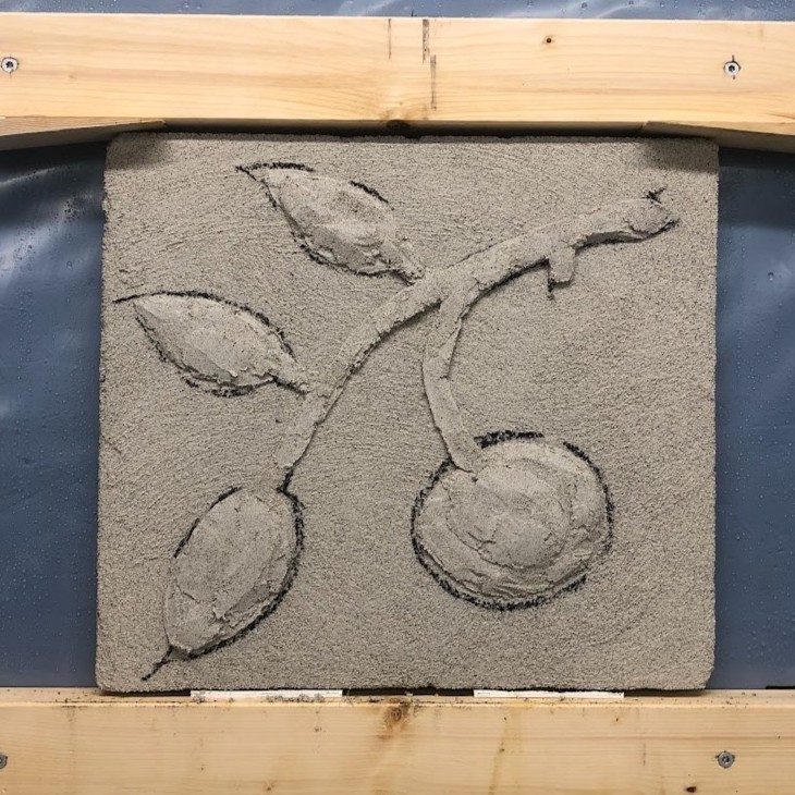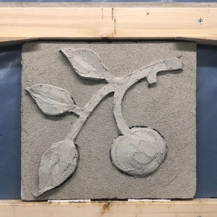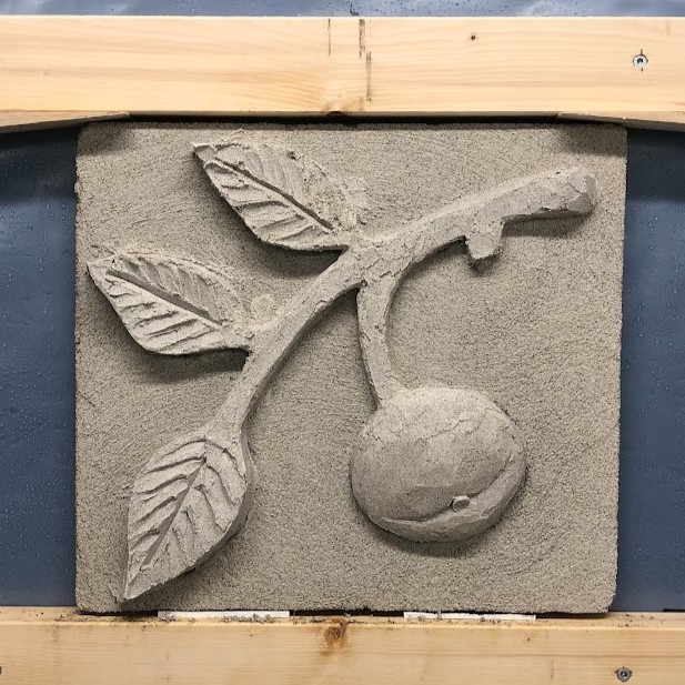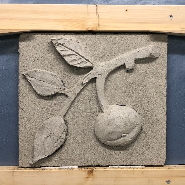 Ellers kunne jeg jobbet glattere og mer «blokkete» med motivet (som fasadeornament hadde det tålt mye mer «blokking»), og komposisjonen kunne vært bedre studert innenfor formatet til rammen (platen med puss): formatet kunne vært mere utfylt, med tettere avstand mellom bladene, og flere blader/ frukter.