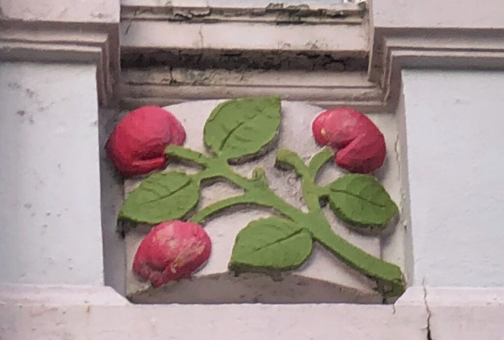 Det er mange fine bladmotiver i Ålesund. Blad- og frukt- motivene fra Kirkegata 4 er nok en favoritt for meg med sitt litt enkle og naive uttrykk. Særlig bladene her er ganske likt modellert som på rosebladdekoren som var på Kongens gate 16 (nå tapt), men som finnes på foto.