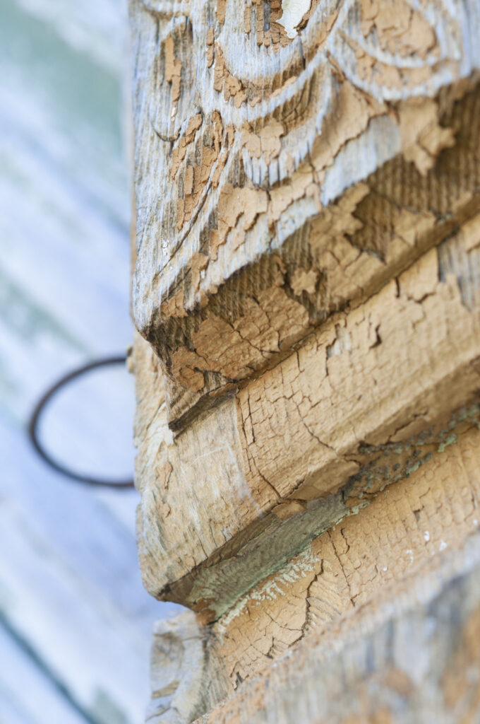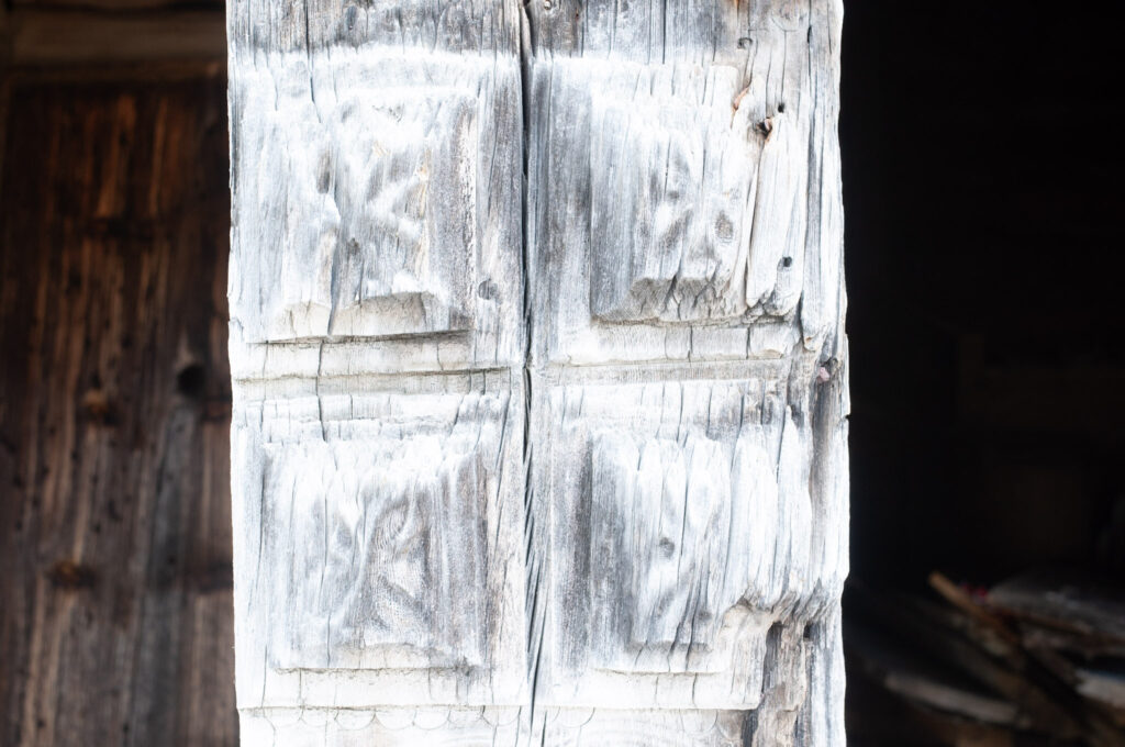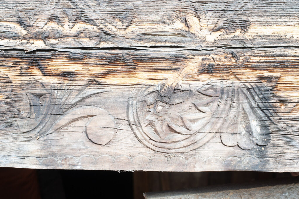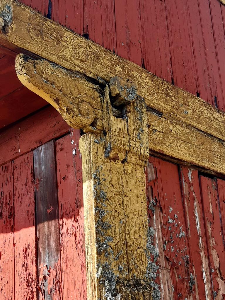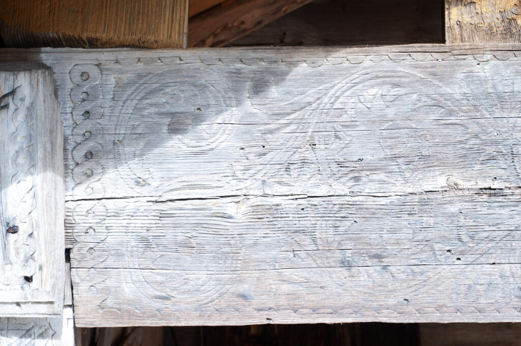 Fotografiet viser et område av utskjæringene som har stått dekket til bak en av stolpene, og som nesten ikke har blitt nedbrutt. Over og rundt ser vi hvordan været og tiden har tæret ned overflaten. (Foto: Jon Anders Fløistad).