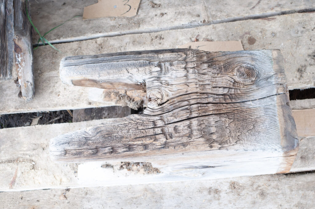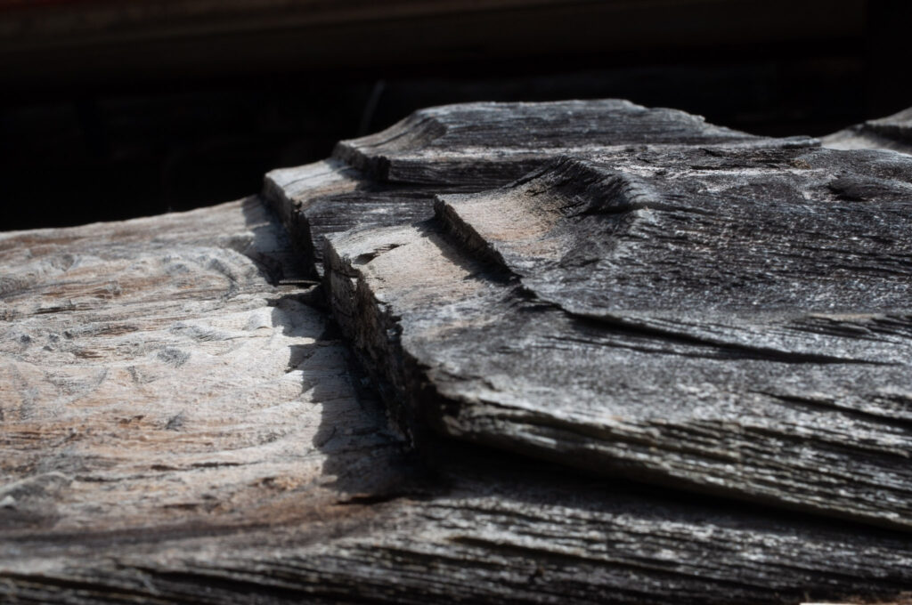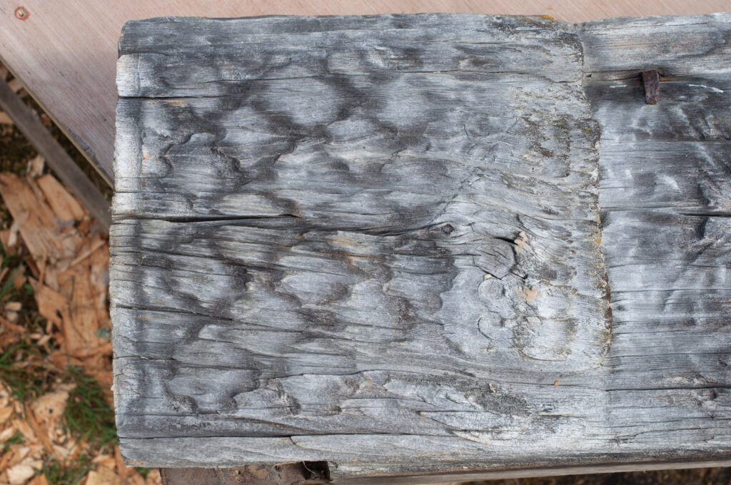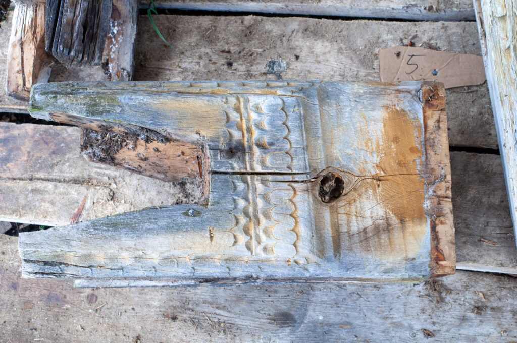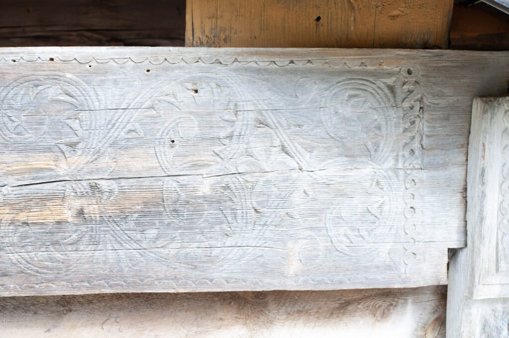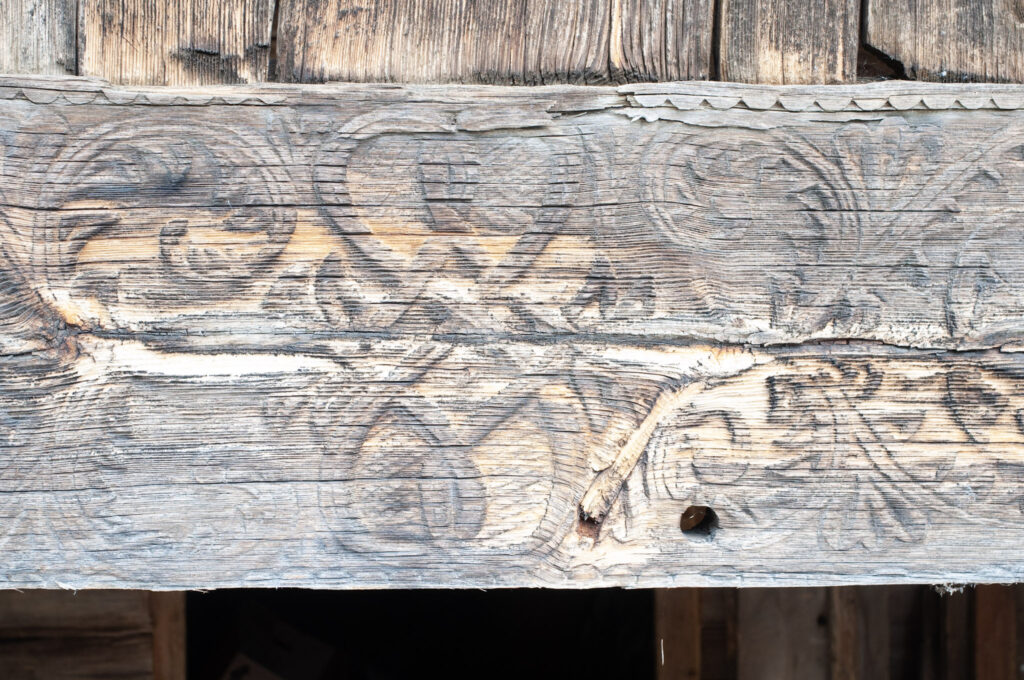 Fotografiet viser et område av utskjæringene som har stått dekket til bak en av stolpene, og som nesten ikke har blitt nedbrutt. Over og rundt ser vi hvordan været og tiden har tæret ned overflaten. (Foto: Jon Anders Fløistad).