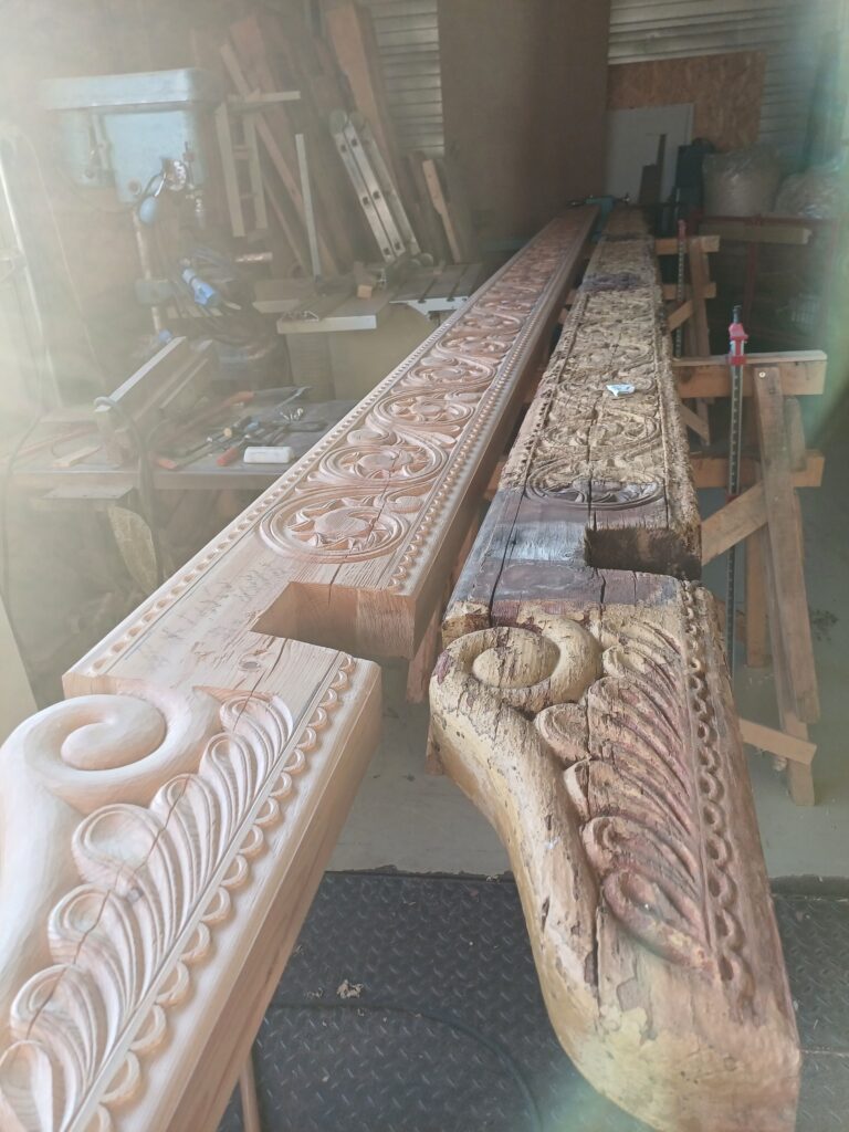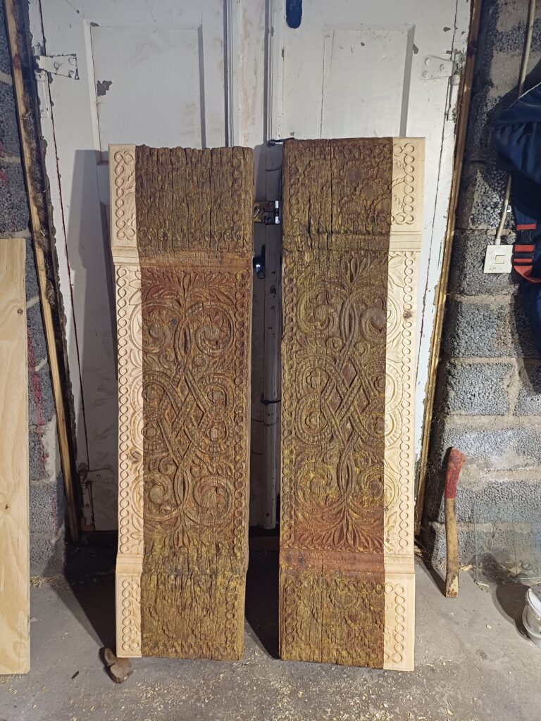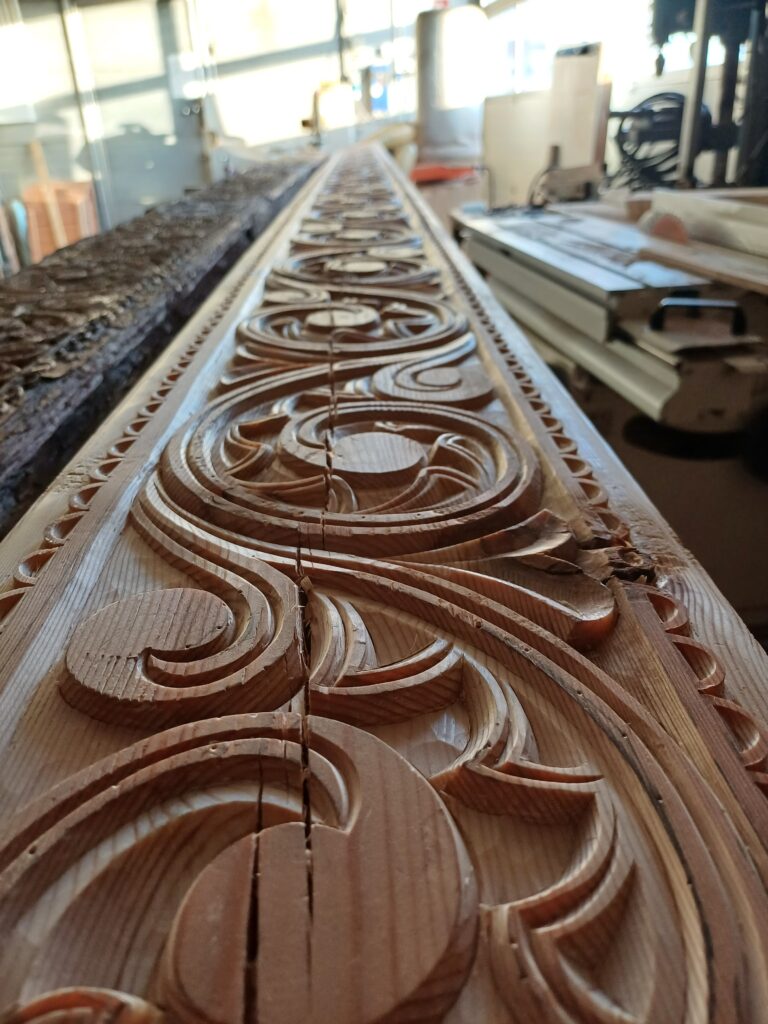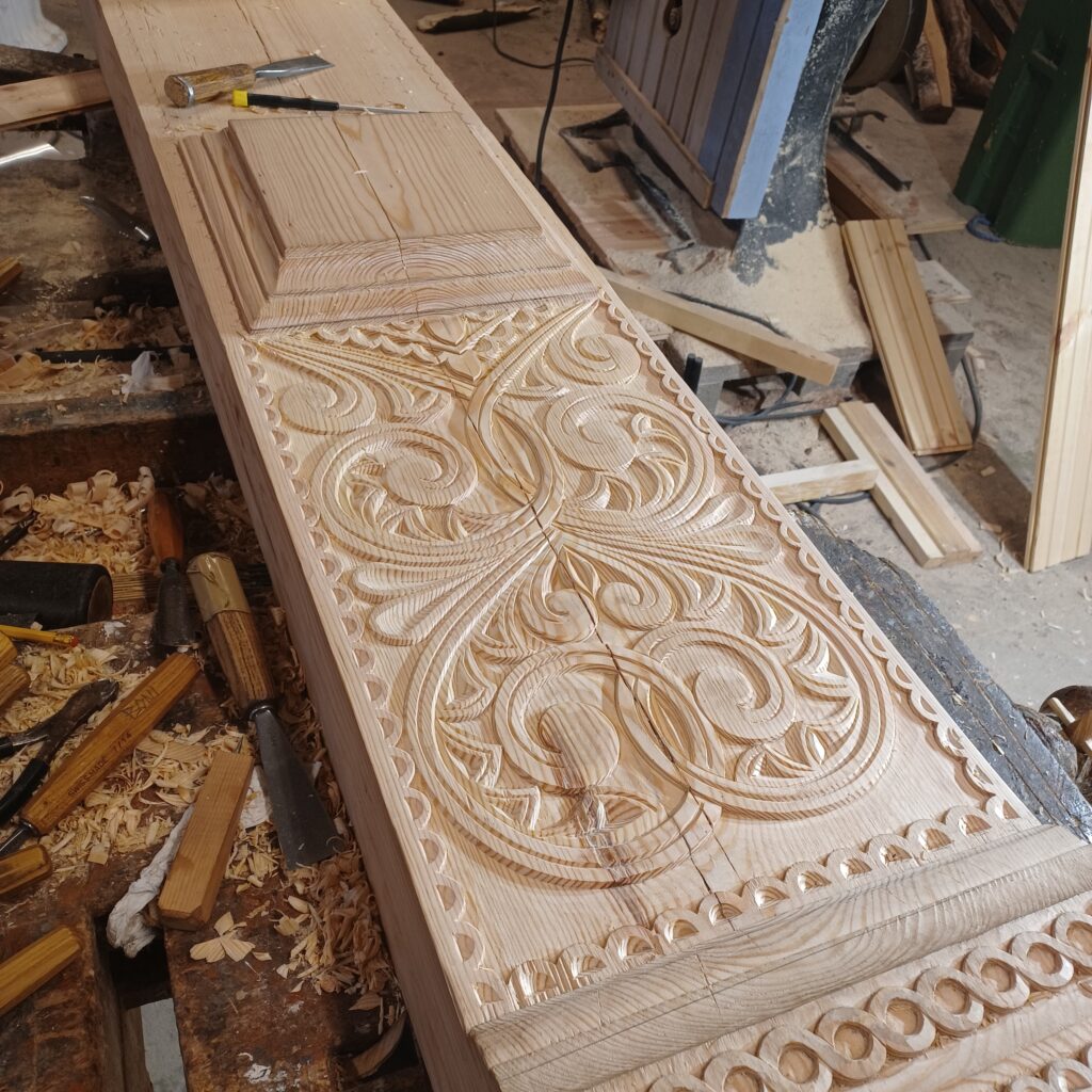 På dette prosjektet gikk vi mer «gammeldags» til verks. Til stede var en gruppe erfarne treskjærere, som har arbeidet mye med forskning og rekonstruksjonsarbeid rundt eldre treskjæring.