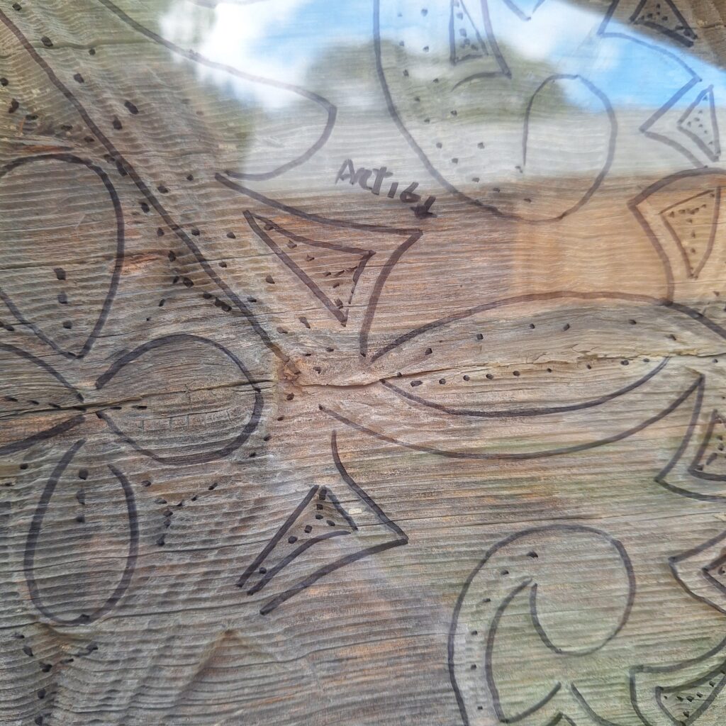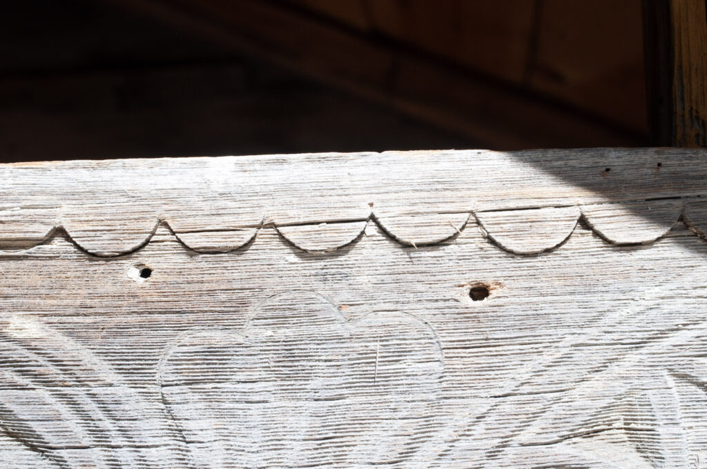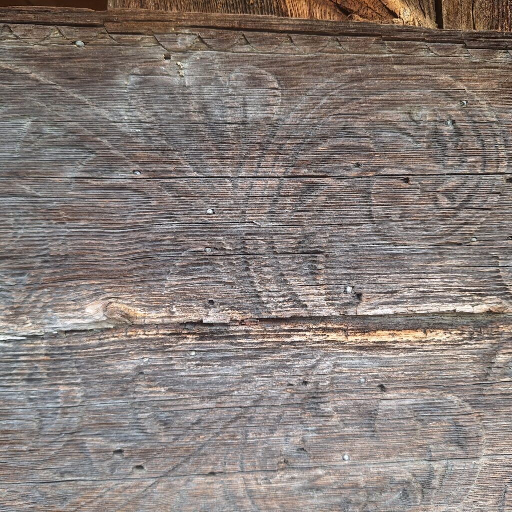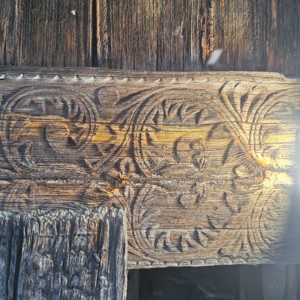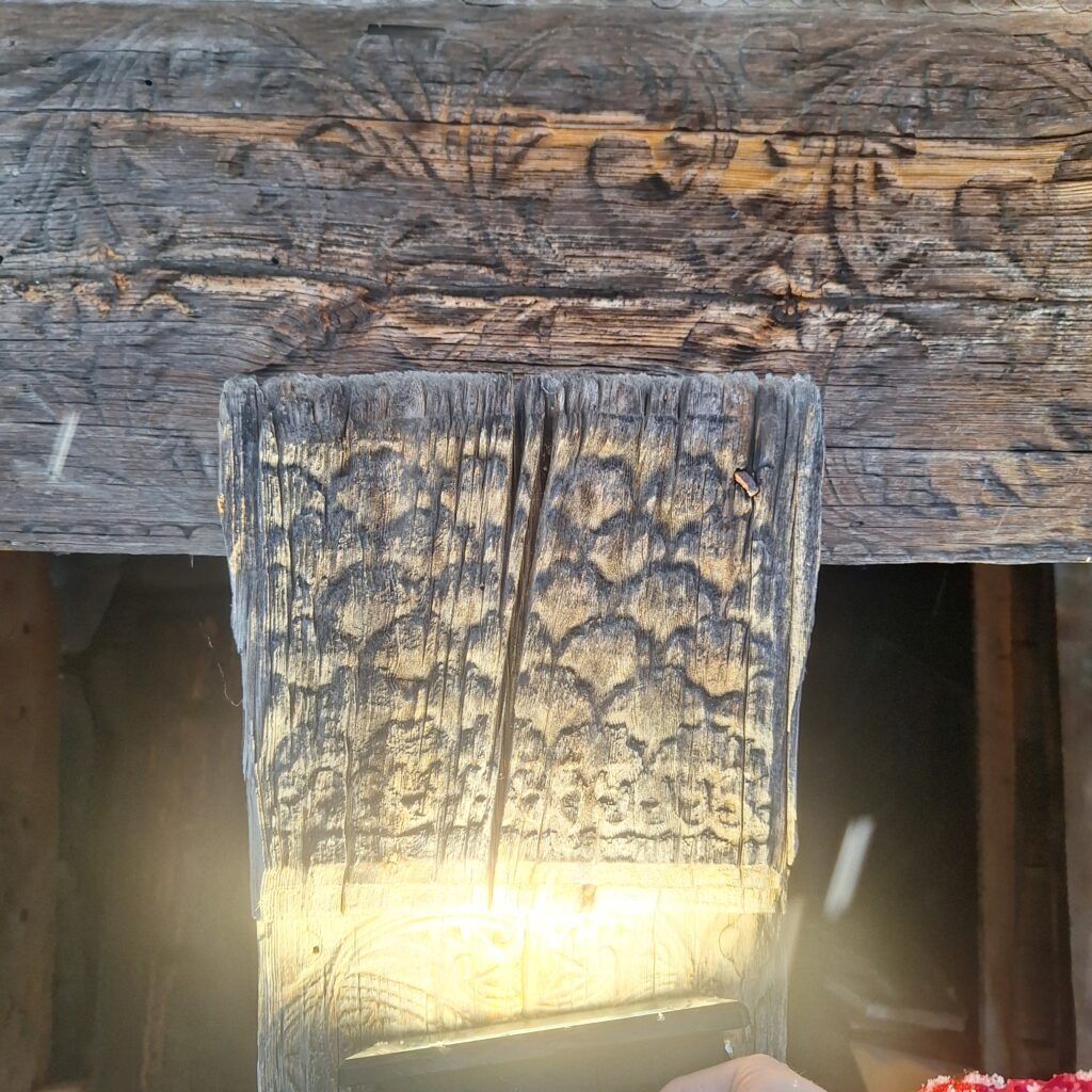 Det finnes utskjæringer på svillen også. Dessverre må jeg innrømme at svillen ble litt stemoderlig behandlet under denne befaringen. Dels fordi den var litt vanskelig å komme til på det tidspunktet, men mest fordi vi ikke rakk å få undersøkt den nøyere.