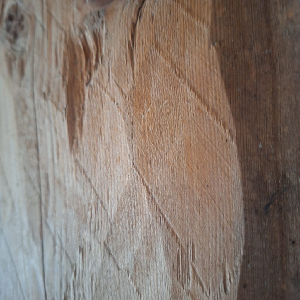 Vi fant ingen rester etter maling eller annen overflatebehandling. Det var skutt med hagle på fronten, som gir en artig kunstnerisk effekt, med glitrende små prikker, men det var nok ikke en del av den kunstneriske ide….