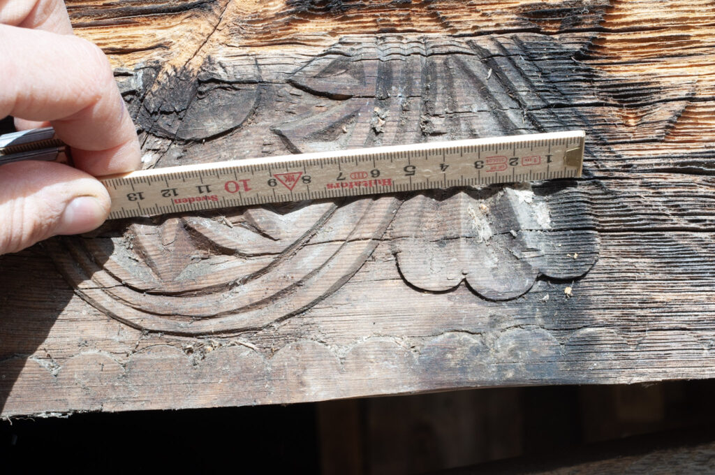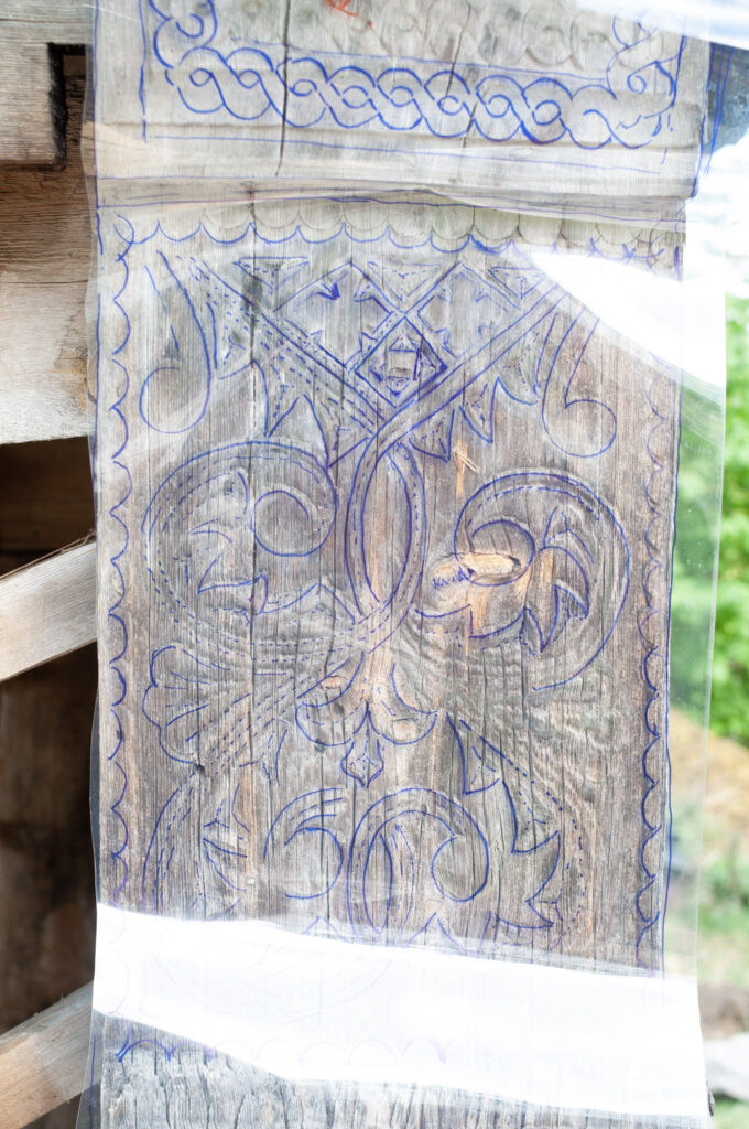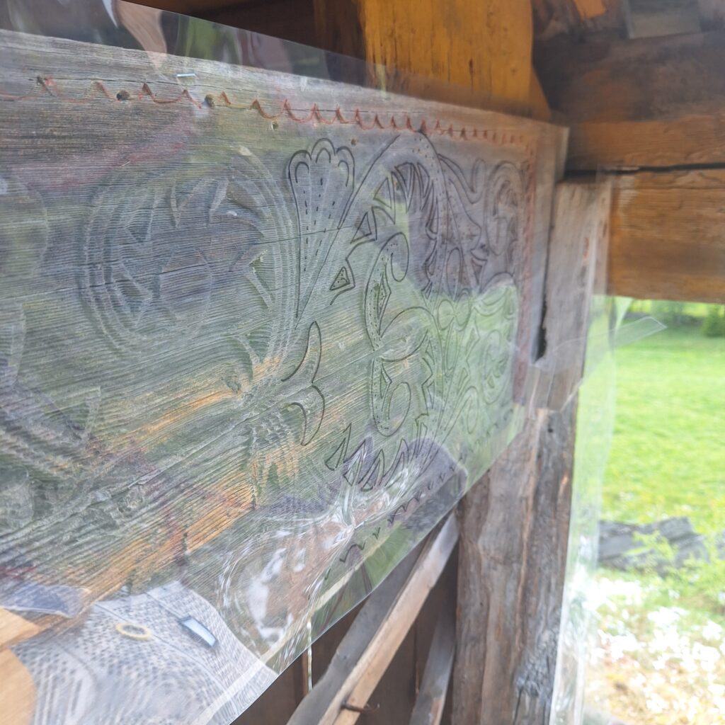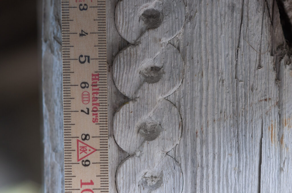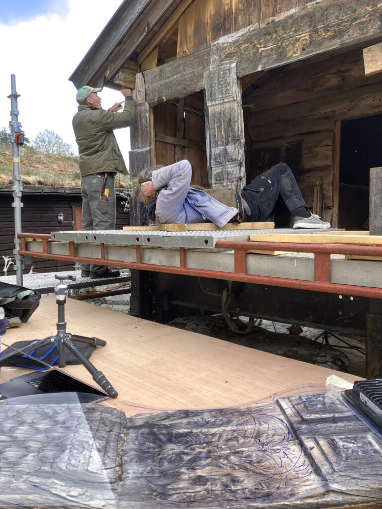 Vi tegnet av all ornamentikken på folie, målte den opp, og fotodokumenterte så godt vi kunne. Vi kartla verktøyspor, emner og alt annet som kunne gi oss informasjon om dekorasjonene.
