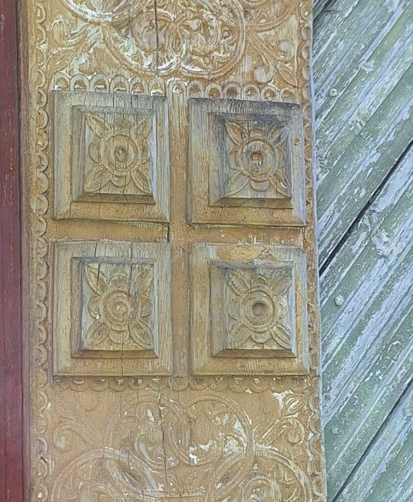 Den befinner seg på klauvene opp og nede på de to stolpene rundt inngangspartiet, og er dessverre temmelig nedbrutt. Ornamentikken består av noe som kan ligne fiskeskjell i et jevnt monotont mønster. Kanten på skjellene er bølgete, med vekselsvis utover -og innoverbølge. Skjellene peker nedover både oppe og nede på stolpene. På sidestolpene er det 8-tallsborder rundt der klauvene griper om stavleggja og utstikkende langsidesvill.