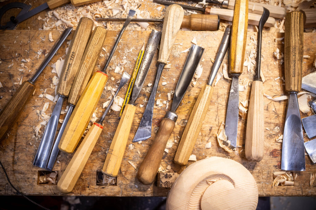 Stadig vekk viser også disse gjenskapningene av gamle verktøy seg å være knakende nyttige også til «moderne» arbeid — som her med et «middelalderjern» (nr. 7 fra venstre, basert på verktøysporet fra Borgund over) midt mellom moderne fabrikksmidde treskjærerjern. Oppdraget på benken her var utskjæringer til et jugendstilhus i Oslo, men utfordringene i treverk og ornamentikk er ganske like om ornamentikken kommer fra 1180-tallet eller 1910-tallet.