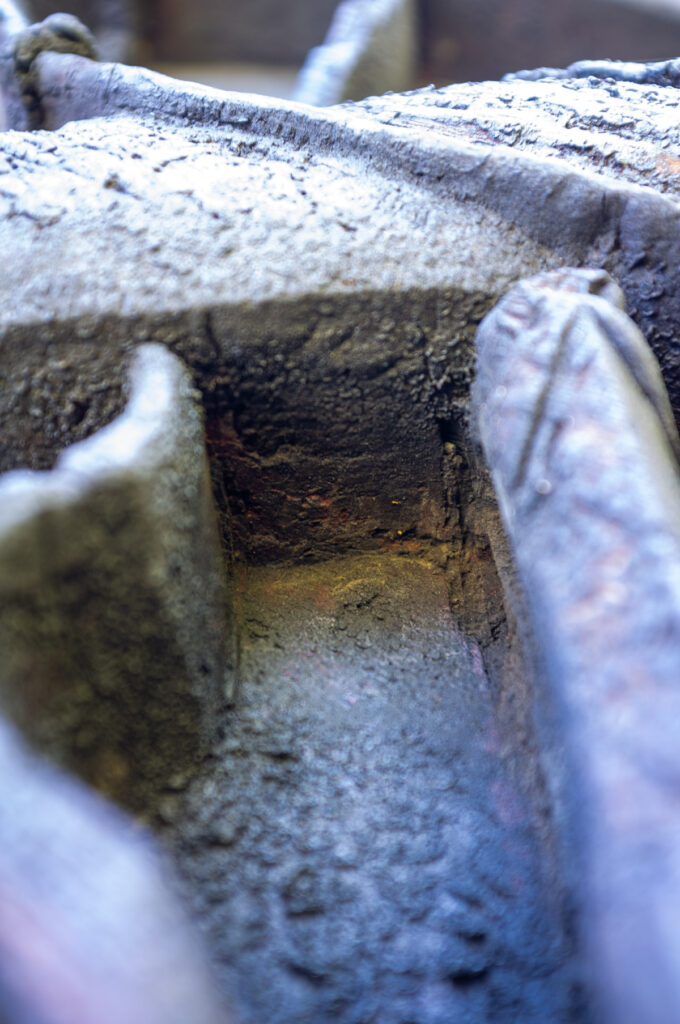 Dette er en utforming som helt klart er «arbeids-økonomisk gunstig»10, og også på dette ganske nette vesle jernet er det lagt inn en tydelig forsterkning der det trengs for å kunne bruke klubbe. Jeg vil nok også likevel tro mye av «bunningen» var gjort med alminnelige rette jern, «Njål fra Motved AS pekte ut én bunn som dette på høyre portalplanke for meg.»11 Men så er det også interessant å nevne at det er noen diskré spor på både Borgunds og Urnes’ portaler som kan se ut som de er fra et bunnjern som dette.