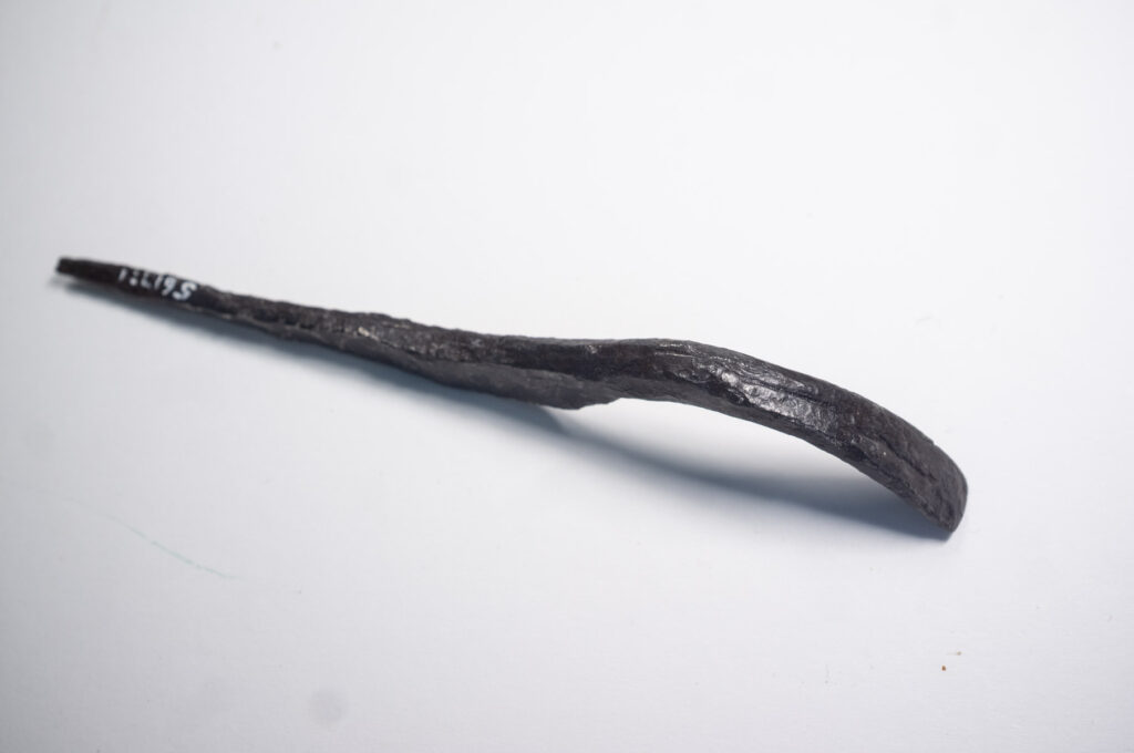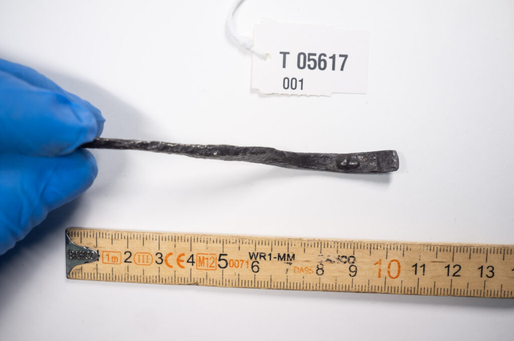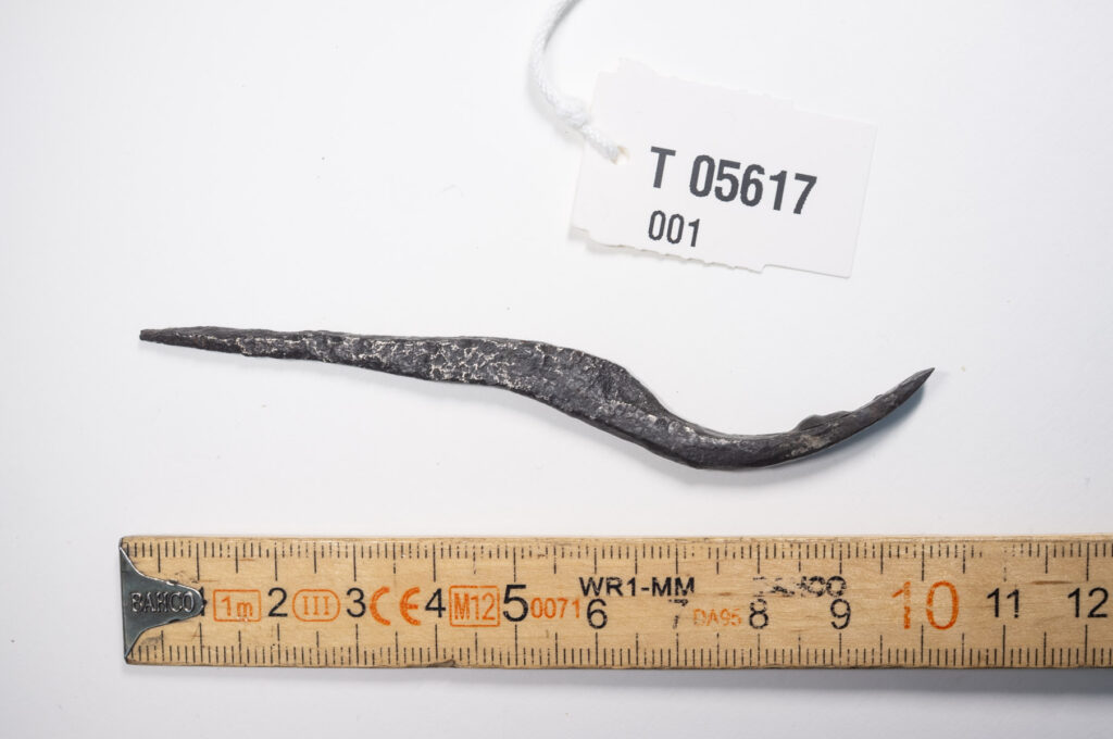 Til Ola Fjeldheim14 og den det måtte angå: Det ikke nødvendigvis iøyenfallende, men påfallende etter å ha lagt merke til det, hvordan dette vesle jernet neppe er et omsmidd rett jern. Formen er så uanstrengt elegant, med akkurat nok ekstra gods i den første bøyen nærmest tangen, at det framstår som resultatet av en planlagt prosess fra starten og ikke en enkel justering av et eksisterende jern for et behov som plutselig oppsto. Hva dette egentlig betyr er jeg foreløpig usikker på, men det minner meg på at jeg gjerne vil diskutere smedens rolle og herdingens mystikk i tidlig middelalder med noen som har peiling på dette. Jeg lurer på om «det å bare smi om» et verktøy var mindre innlysende enn vi ser for oss det i dag, med all den mystikken smedarbeid og herding fra gammalt av sies å ha vært omgitt av?