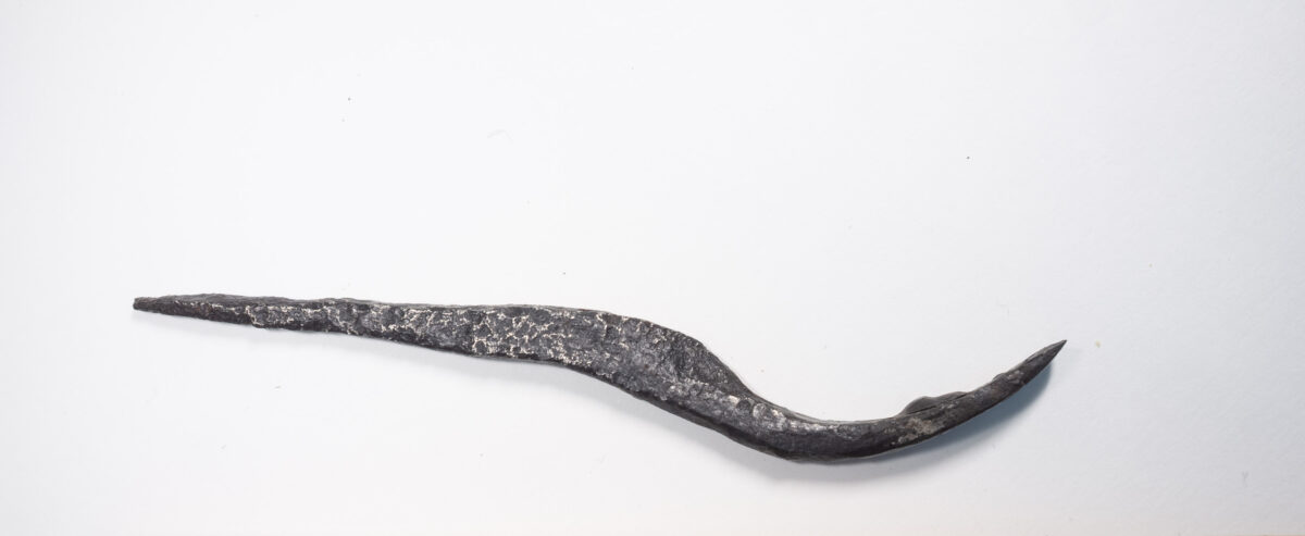 Til Ola Fjeldheim14 og den det måtte angå: Det ikke nødvendigvis iøyenfallende, men påfallende etter å ha lagt merke til det, hvordan dette vesle jernet neppe er et omsmidd rett jern. Formen er så uanstrengt elegant, med akkurat nok ekstra gods i den første bøyen nærmest tangen, at det framstår som resultatet av en planlagt prosess fra starten og ikke en enkel justering av et eksisterende jern for et behov som plutselig oppsto. Hva dette egentlig betyr er jeg foreløpig usikker på, men det minner meg på at jeg gjerne vil diskutere smedens rolle og herdingens mystikk i tidlig middelalder med noen som har peiling på dette. Jeg lurer på om «det å bare smi om» et verktøy var mindre innlysende enn vi ser for oss det i dag, med all den mystikken smedarbeid og herding fra gammalt av sies å ha vært omgitt av?