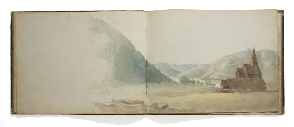 Stavkirkene har vært drøftet i kunst og i litteraturen i snart trehundre år. Her sett i akvarell-form av Thomas Fernley fra 1826, gjenoppdaget av Nick Walkley i hans doktorgrad (2025 s. 107)