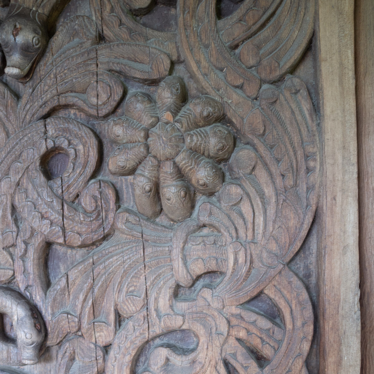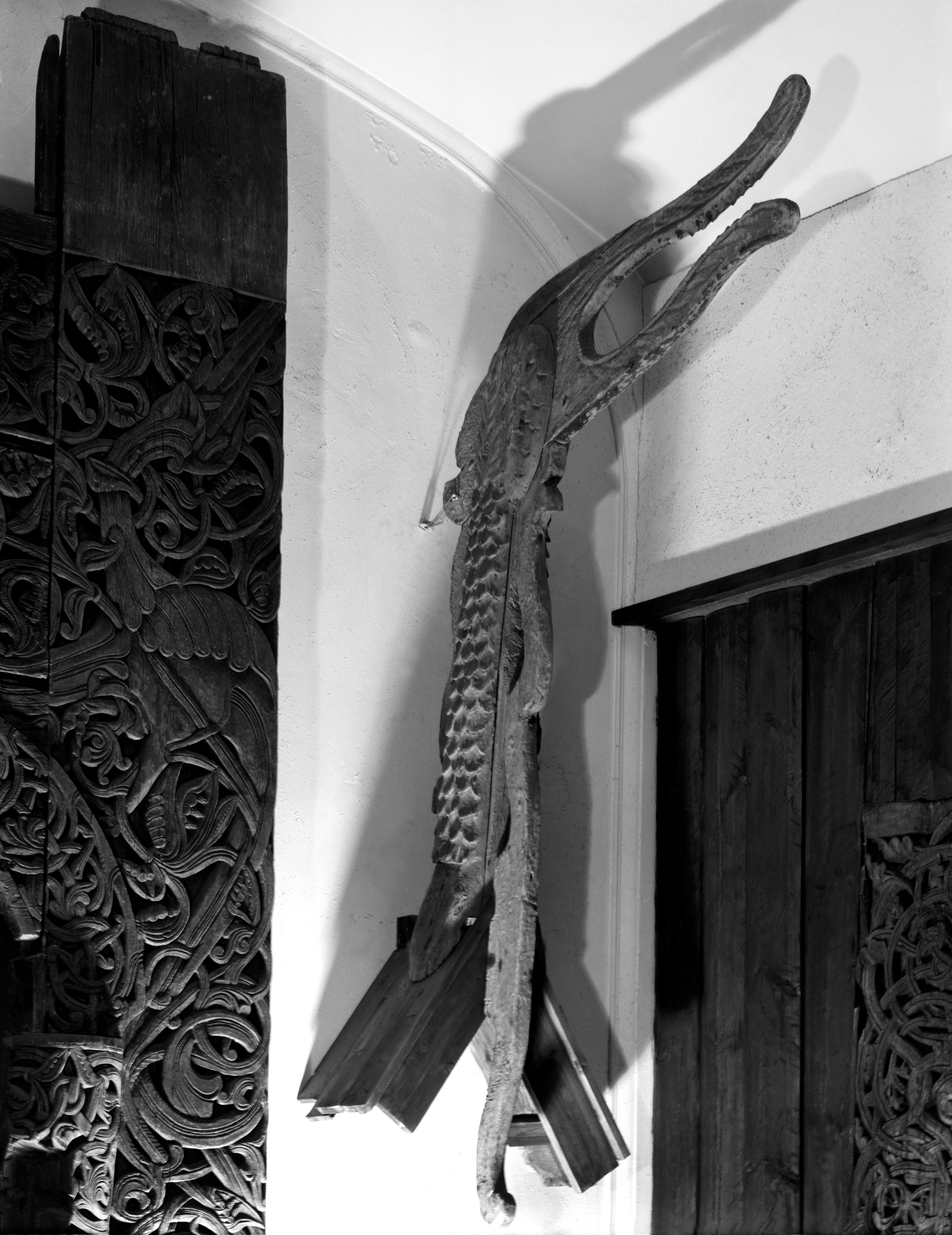 Interiør denne gangen, og også denne gang i et ganske lite format, som inviterer til litt leting. Klokkerpulten fra Heddal (NF.1907-0258) er et spennende men relativt lite omtalt møbel, og om det i det heletatt har sin opprinnelse i Heddal har vært diskutert. Den diskusjonen får bli en anna gang, for nå er dette vesle dragehodet fokus. Lengst ute til venstre, midt på omtrent, kan det som nok forestiller hodet på ormen/dragen Fåvne sees. Det er ganske abstrahert, og opp-ned, men rett over Sigurds sverd spytter et dragehode ut starten på den ranken som fyller mye av bildet. I form og «funksjon» har dette mye til felles med det løve- eller dragehodet som ofte er «kilden» til Sogn-Valdres-stavkirkeportalenes ranker – dette passer i grunnen ikke så verst om dette møbelet er skåret av noen med erfaring med stakirkeportal-skjæring, og som har støtta seg på en kjent «oppskrift».