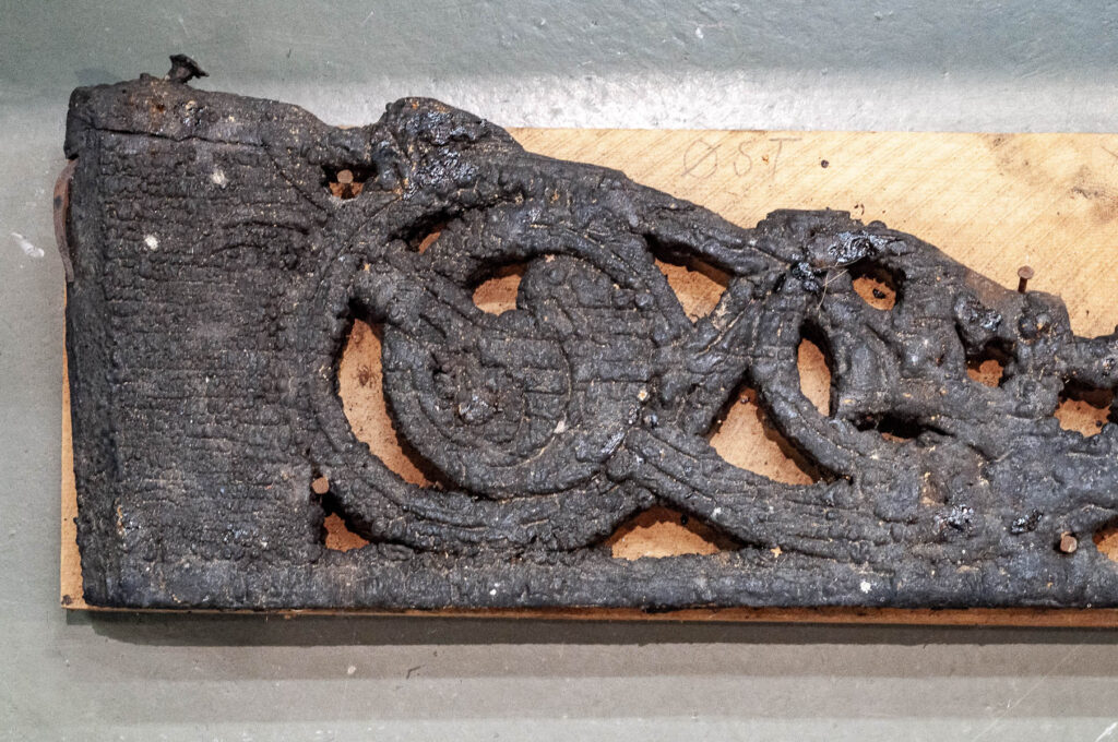 Til slutt, som en liten ekstra gave, legger jeg ved et bilde av den eneste biten med bevart middelaldersk mønekam fra Borgund stavkirke jeg kjenner til. Bildet er mitt eget, og så vidt jeg vet omtrent eneste bilde på internett av dette unike stykket arkitektonisk middelalder-treskurd. Biten bor hos de Heibergske samlinger i Sogn, men er ikke utstilt. Denne blir helt sikkert gjenstand for et eget innlegg og dypere granskning senere, men enn så lenge er det verdt å dvele litt ved hvor utrolig flott arbeid treskjærerne på 1180-tallet gjorde seg selv med de delene som skulle monteres i vind og vær, høyt oppe på takene.