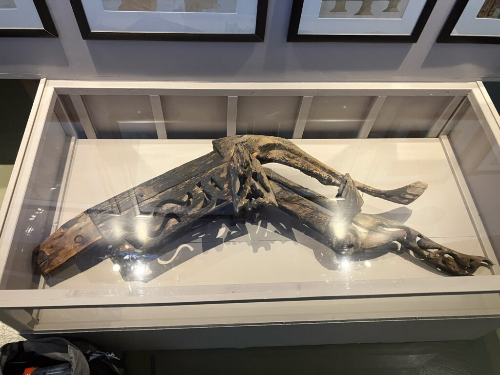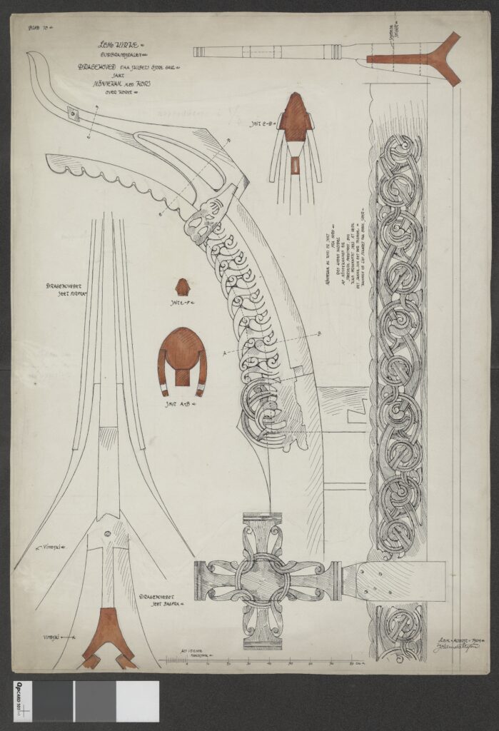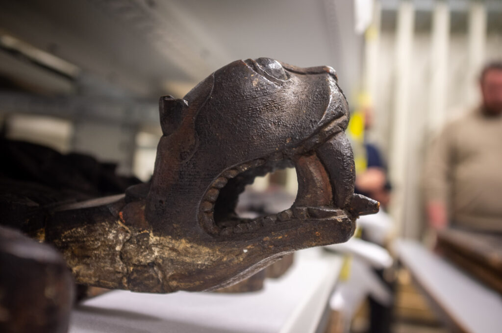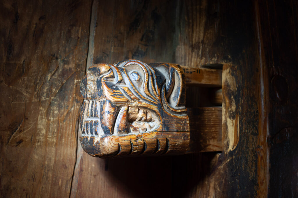 Det er vanskelig å komme utenom denne når temaet er «dragehoder». Gavldrage fra Borgund stavkirke, bytta ut i 1933, antatt av Anker19 å være en erstatning fra 1738 siden den tilsynelatende har sammenheng med en mønekam hvor dette årstallet er utskåret. Dette er tydelig mer forseggjort enn de to ‘gamle’ gavldragene som ble uskifta i 2010 og er oppbevart på Borgund (se innlegget «Dragejakt» (2. september 2025) for mer om dette). Det er dermed fristende for meg å tenke at dette er det eldste av de bevarte fra Borgund, med minst en ‘generasjon’ imellom. Men jeg er heller ikke overbevist om at dette er eldre enn 1738, selv om jeg gjerne lar meg overraske. En omtrentlig datering basert på naturvitenskaplige metoder hadde vært veldig spennende.