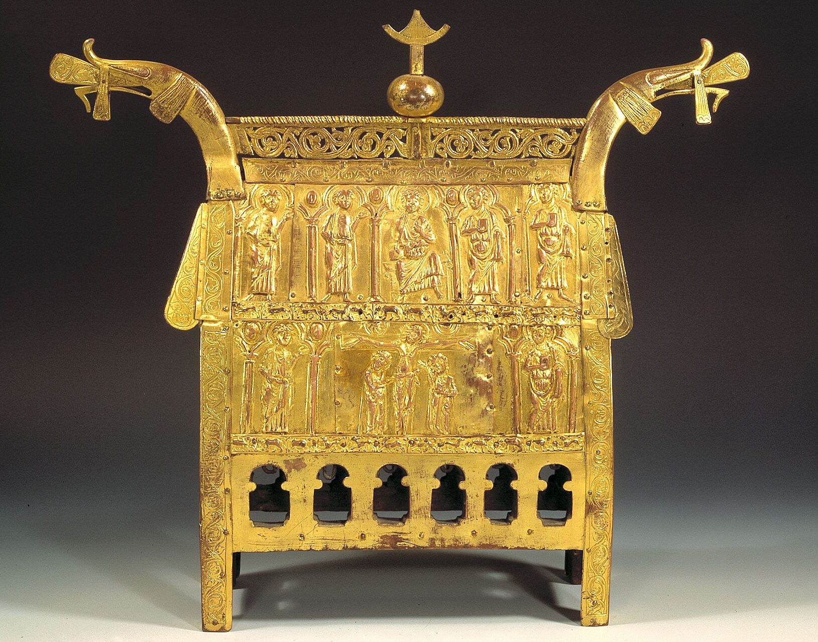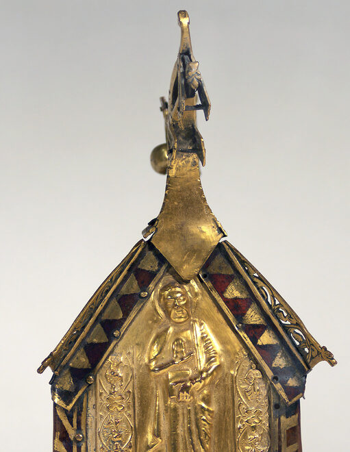 Relikvieskrin er ofte påfallende arkitektoniske i formen, ja, nesten som små kirker? Og er det ikke noe ganske kjent med øynene, med hodeformen og uttrykket på beistet som glefser ut fra «mønet» på dette skrinet?