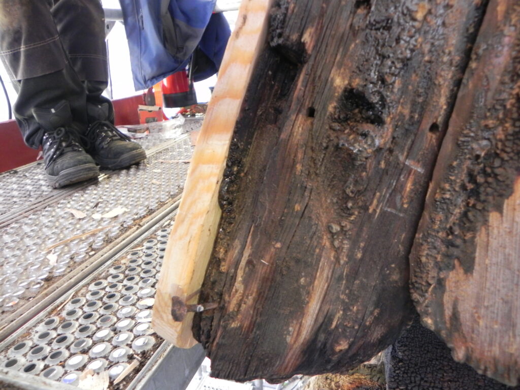 Det er ofte artigere å betrakte tilstedeværelsen av noe enn fraværet. I tjue luker av adventskalenderen til nå har nettopp tilstedeværelsen av et drage-/dyrehode vært poenget, og i luke tjueen ble tilstedeværelsen av hoder på ett skrin brukt til å understreke fraværet på et anna. I dag er første luke fullstendig uten hode, og bildet under illustrer ett av målene for min søken som også har ført til denne kalenderen. Bildet er av ytterst på et hjørne av takrytterens midtre etasje – alle fire hjørner av det midtre og det øvre taket har visst liknende spor. Her er avtrykk (en utsparing) av ‘noe’ som har vært spikra fast, og til alt overmål også noen av spikrene som i sin tid har festet det. Hva som har vært her er ikke godt å si, men jeg har en mistanke om at det har vært et hode av noe sorts, særlig basert på en del av de eksemplene jeg har trekt fram i kalenderen til nå.